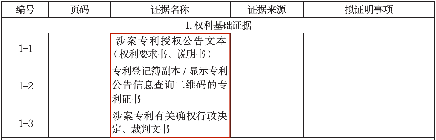 此外,还需在证据材料中提交涉案专利授权公告文本(权利要求书、说明书)、专利登记簿副本/显示专利公告信息查询二维码的专利证书、涉案专利有关确权行政决定、裁判文书等证明材料。