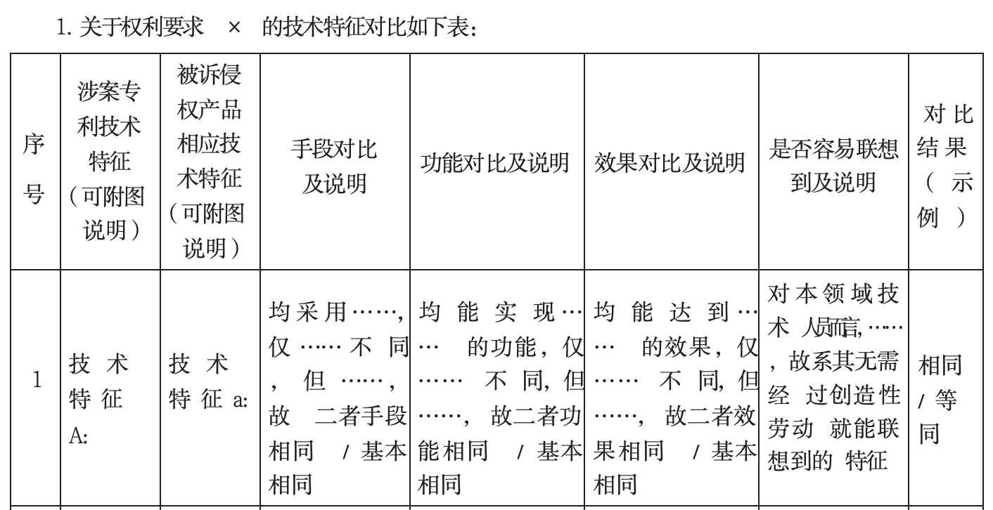 附件2技术特征对比分析表为必填附件,在侵害发明专利权纠纷案件中,技术特征对比分析表是核心意见之一,将直接关系到案件的侵权判定结果。需按“技术特征逐一对比”的方式进行分析,不得遗漏或合并特征,需要写明具体的技术比对过程。在侵权对比的过程中,所有据以主张权利的权利要求都要进行对比。