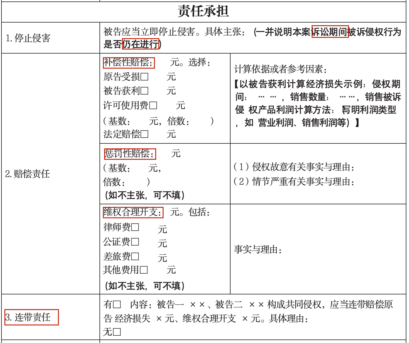 对于赔偿经济损失、赔偿维权合理开支、连带责任的填写指引可参考第五部分责任承担中的说明。