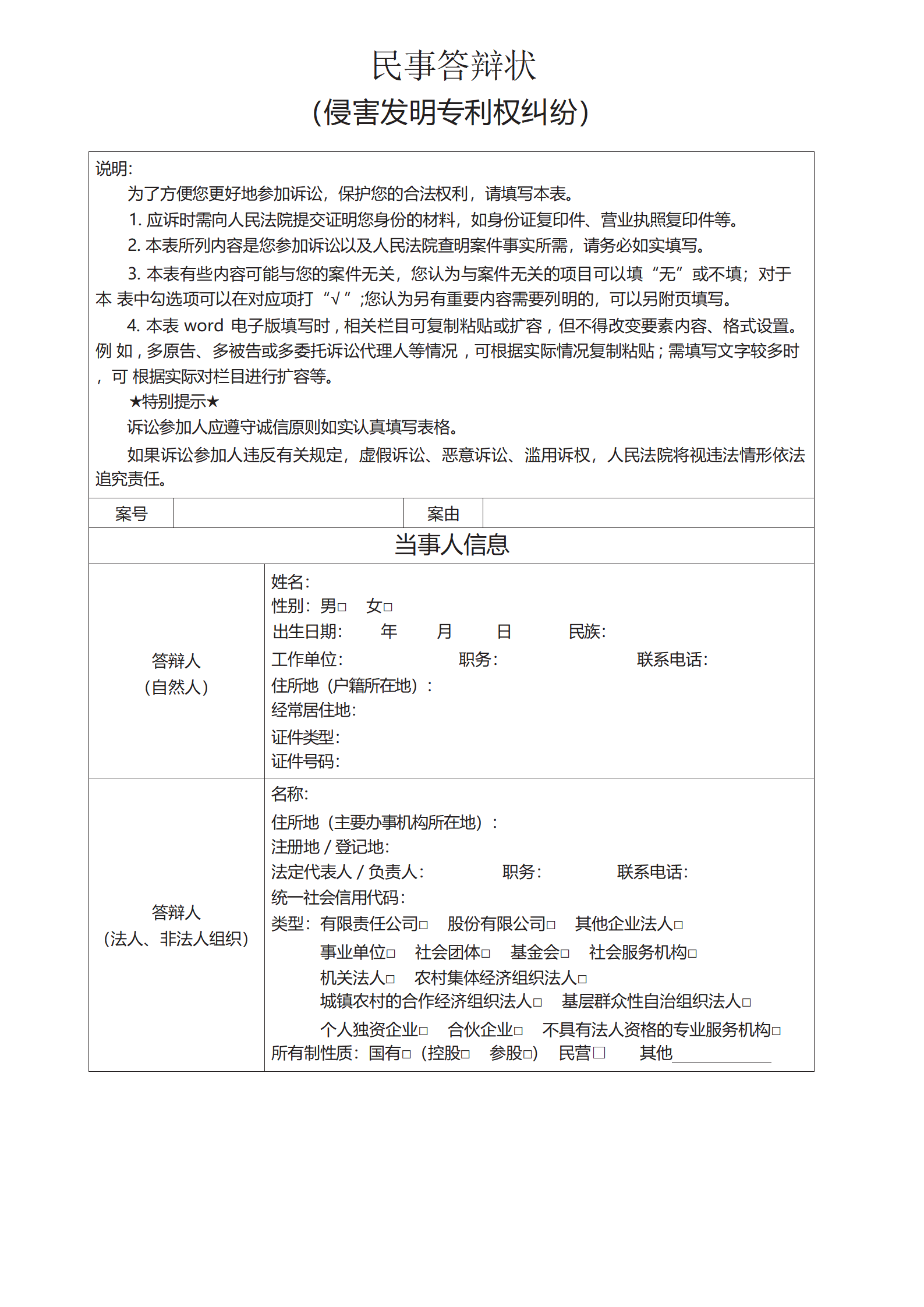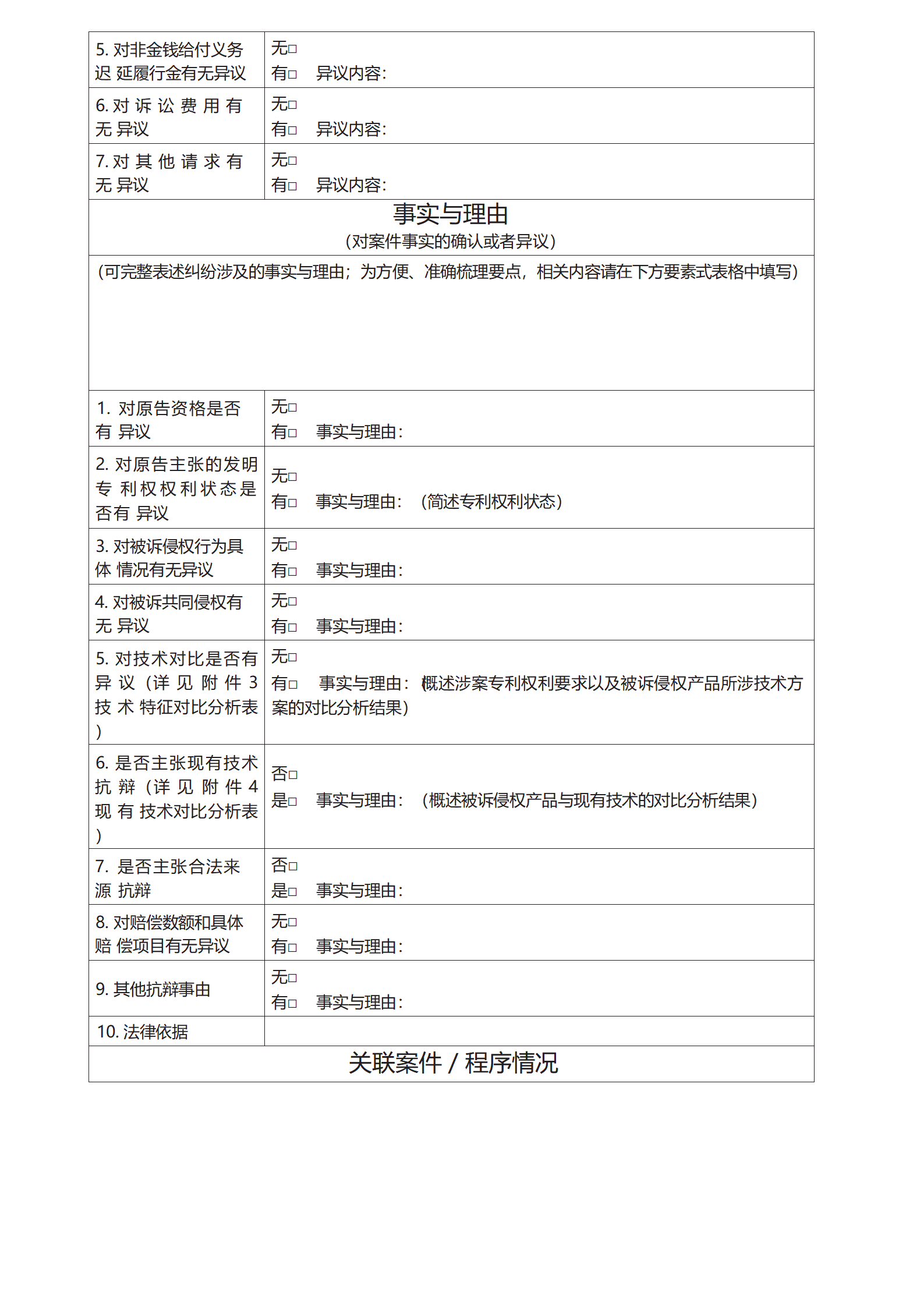 在填写“事实与理由”时,需对应原告提出的事实和理由,逐项确认“有/无”异议。如果选择“有”,要写明“异议”的具体内容、相关事实以及所依据的法律规定,比如被诉侵权产品的技术特征与涉案专利权利要求记载的技术特征是否相同或等同,原告主张的惩罚性赔偿是否符合法律规定的适用条件等。