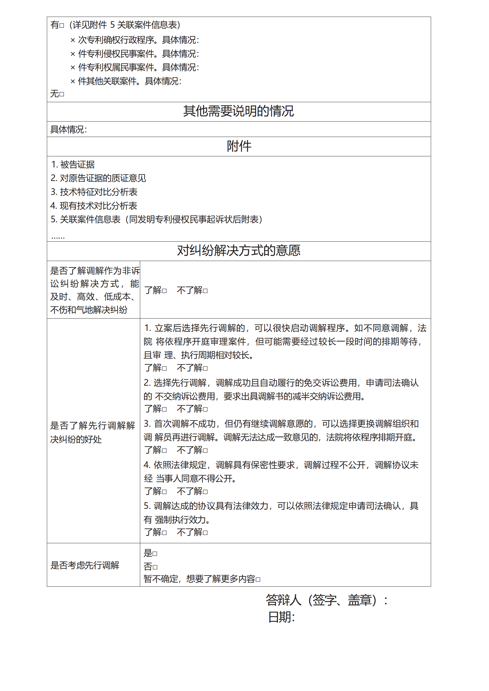 答辩状示范文本包含当事人信息、答辩事项、事实和理由、关联案件、其他需要说明的情况、附件、对纠纷解决方式的意愿七个部分。除当事人信息、关联案件、对纠纷解决方式的意愿与起诉状填写要求一致外,还需要注意以下几点: