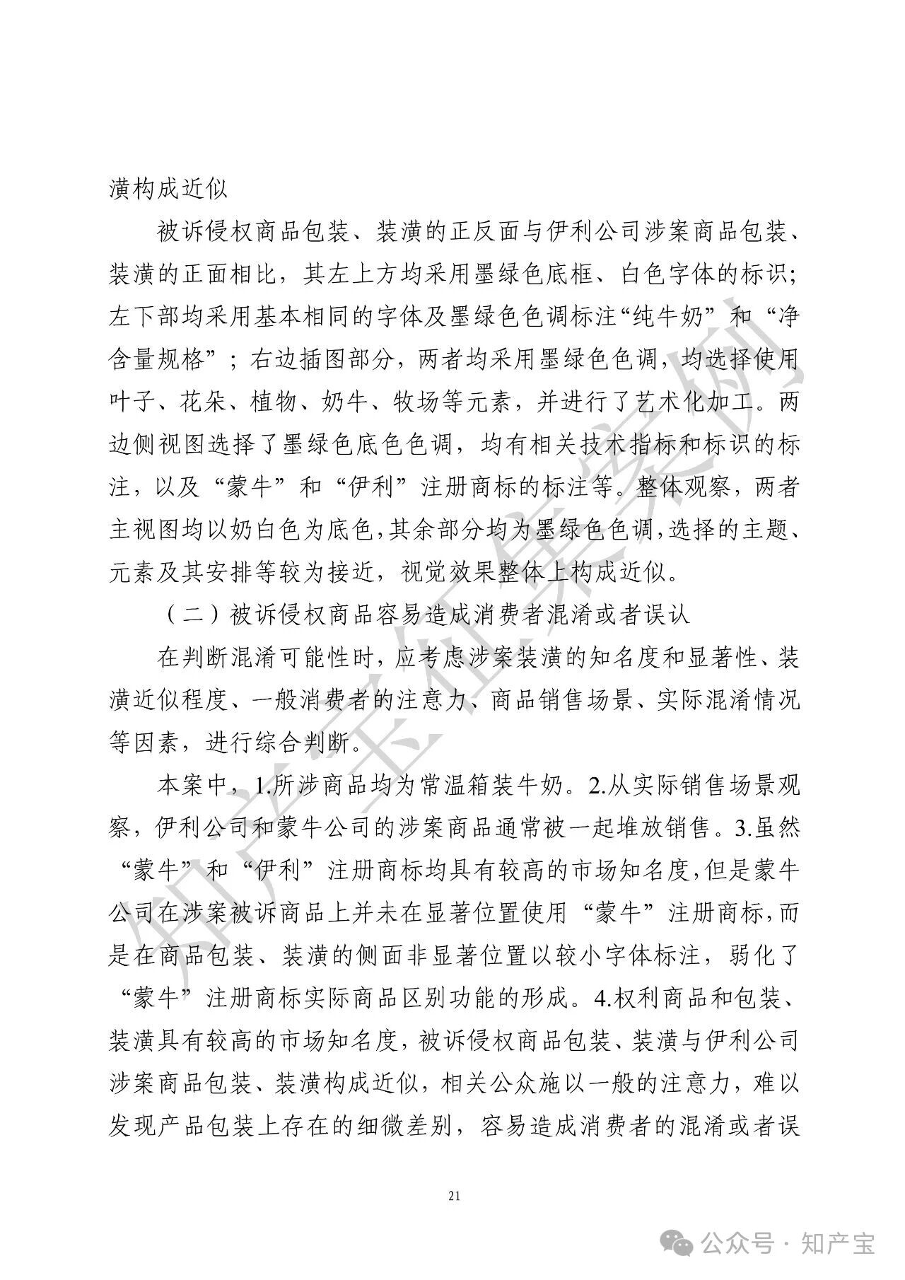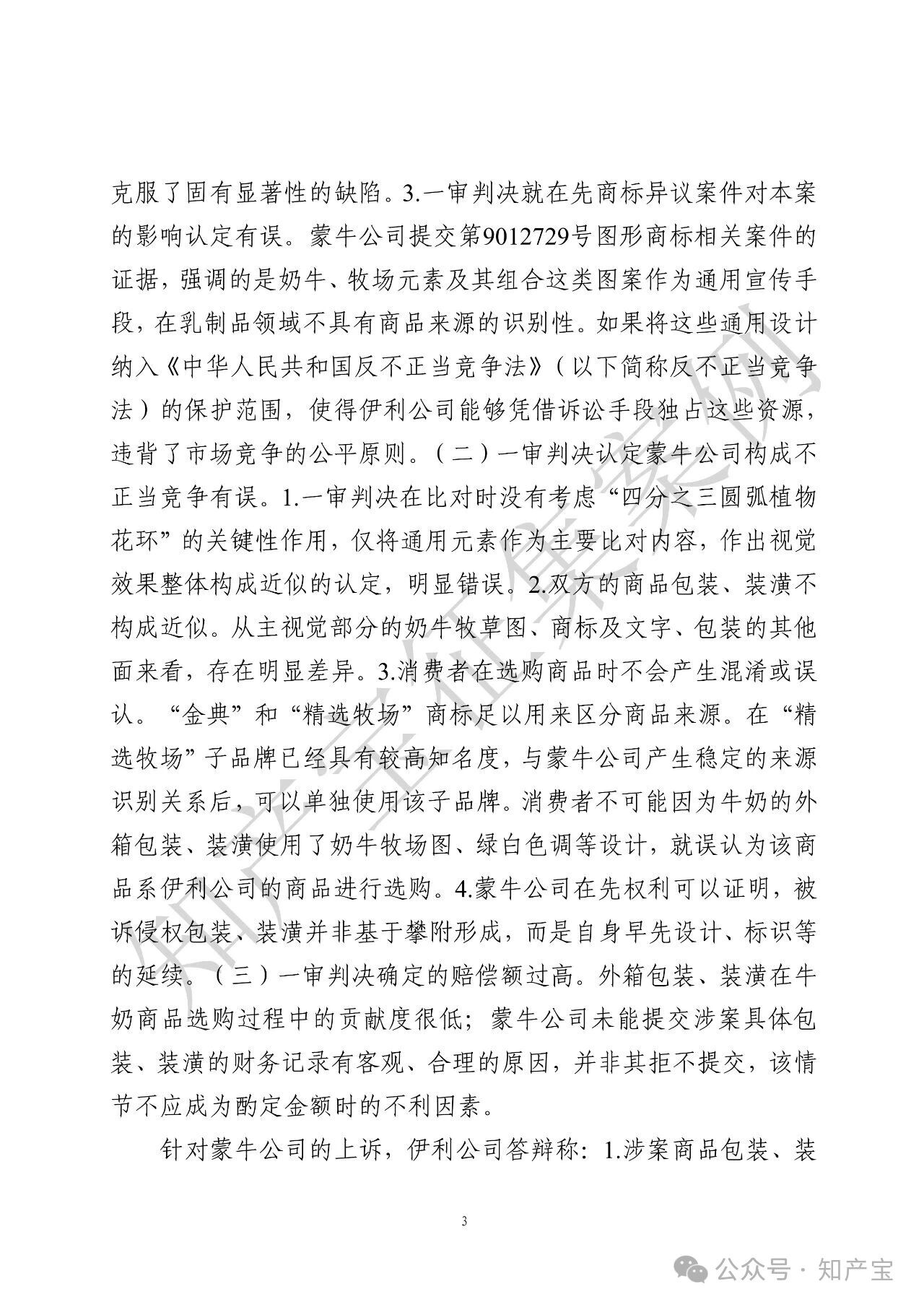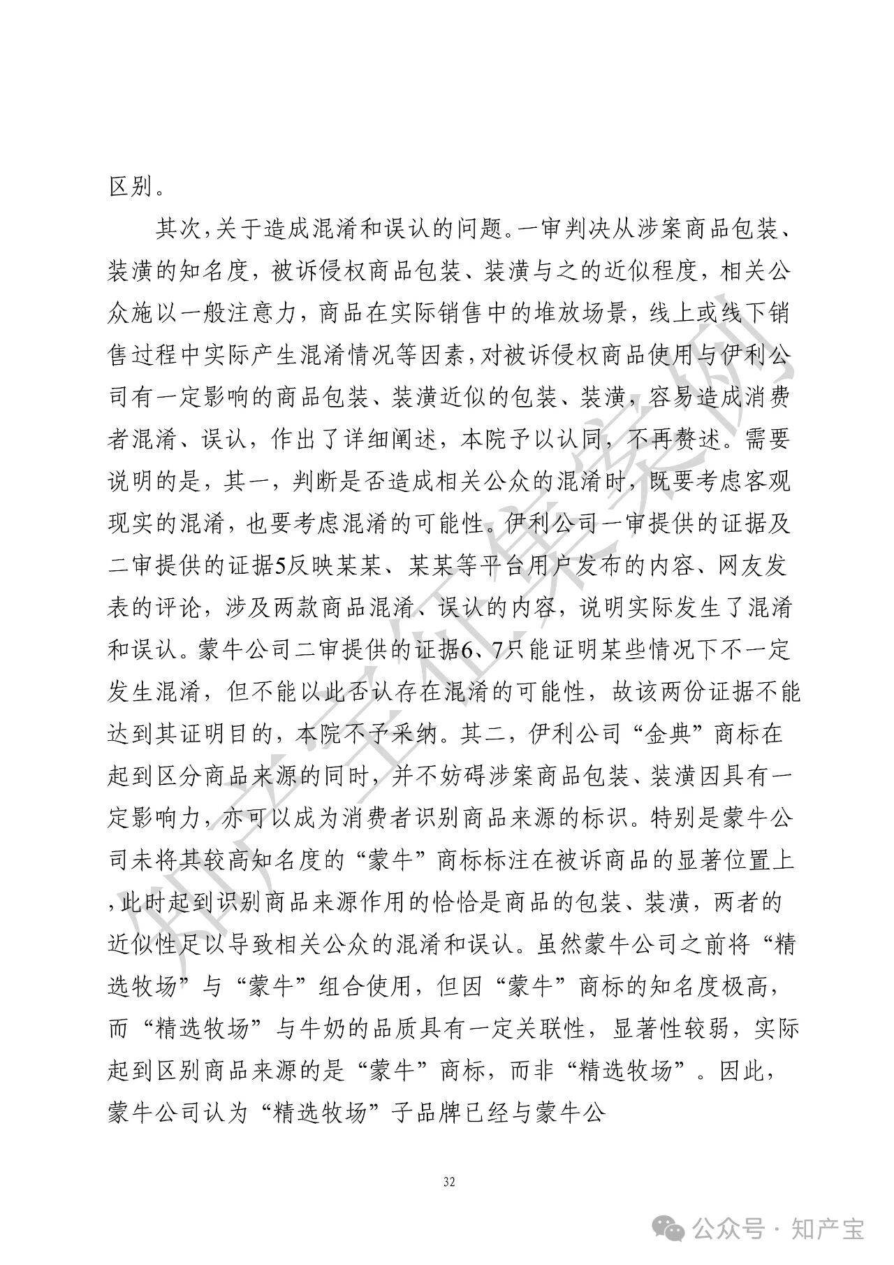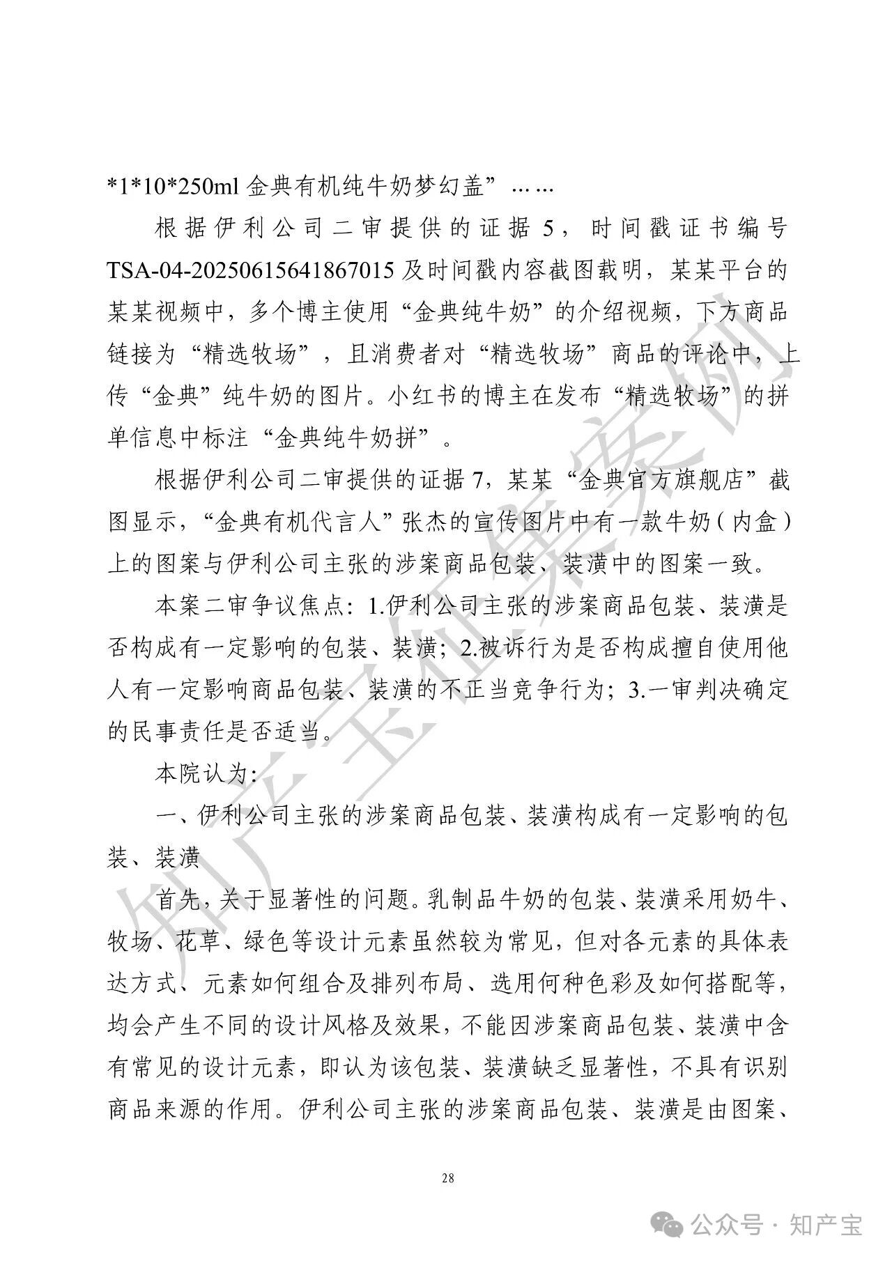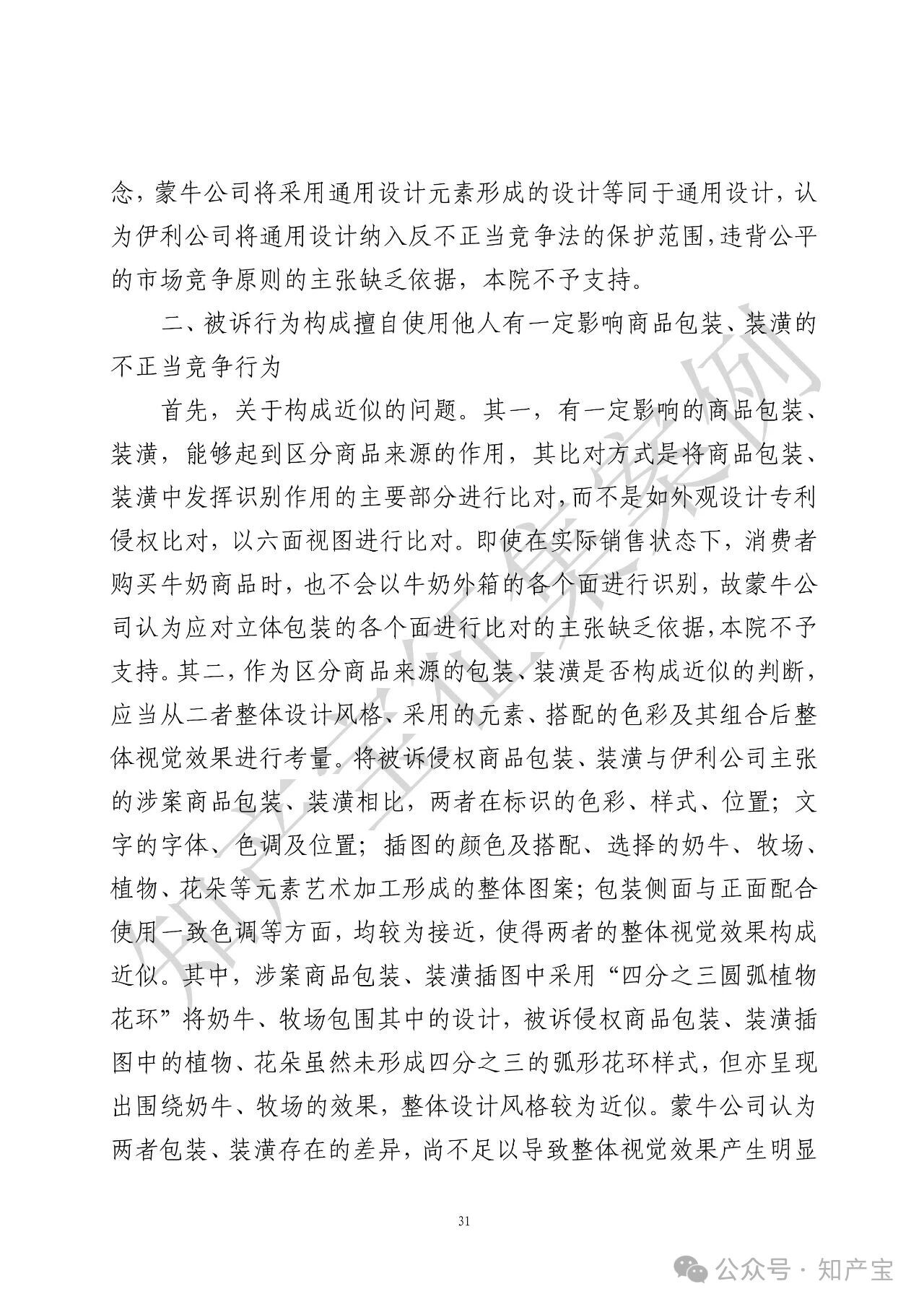 关于被诉行为是否构成擅自使用有一定影响商品包装、装潢的不正当竞争,法院认为:其一,包装、装潢近似比对应聚焦于发挥识别作用的主要部分及整体视觉效果,而非立体包装各面逐一比对。被诉包装与涉案包装在色彩、文字字体/位置、插图元素(奶牛、牧场、植物等)的艺术加工及整体风格上高度接近,局部差异(如插图未形成四分之三弧形花环)不足以区分整体视觉效果,构成近似。其二,结合涉案包装的高知名度、被诉包装的高度近似性、商品销售场景易混淆性及平台用户实际混淆评论等证据,足以认定易导致相关公众混淆。伊利公司“金典”商标的识别作用不排除包装、装潢的独立识别功能;蒙牛公司未在涉案商品上突出使用自有“蒙牛”商标,“精选牧场”子品牌因显著性弱、依赖“蒙牛”商标知名度,无法单独区分来源,故包装、装潢近似足以导致混淆。其三,被诉包装虽使用部分在先元素(如商标、奶牛图案),但其图案排列、整体风格与在先设计差异显著,不构成对在先设计的延续,攀附伊利公司包装、装潢的故意成立。