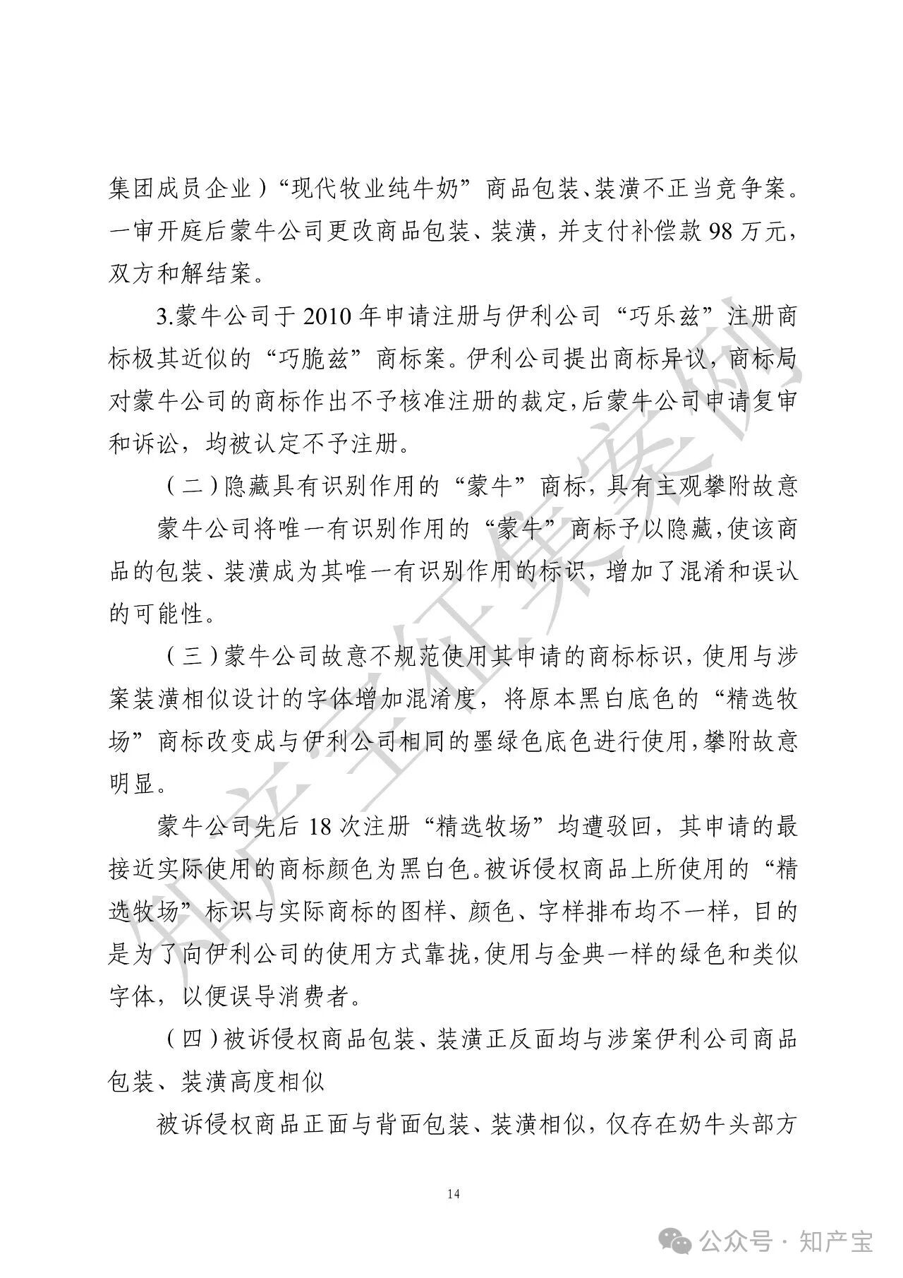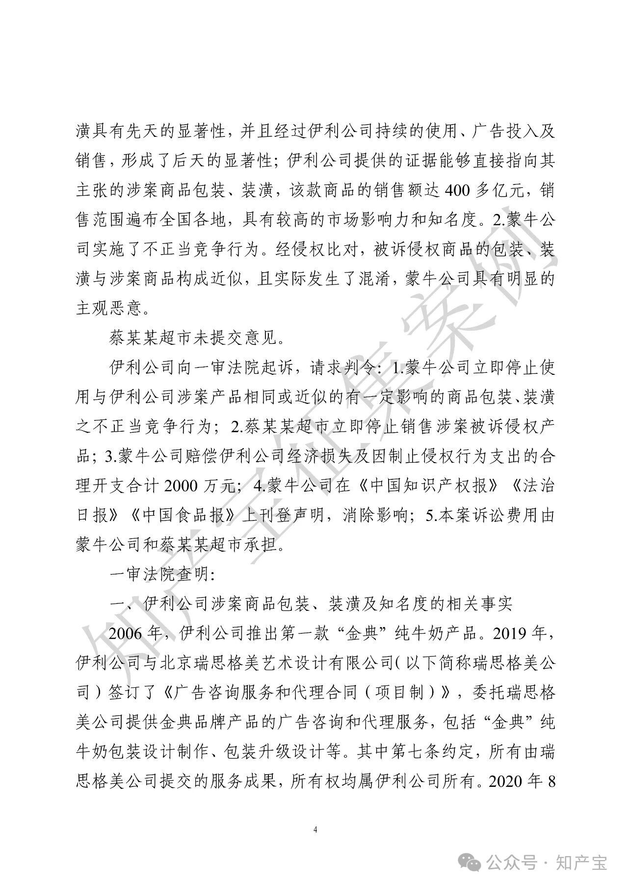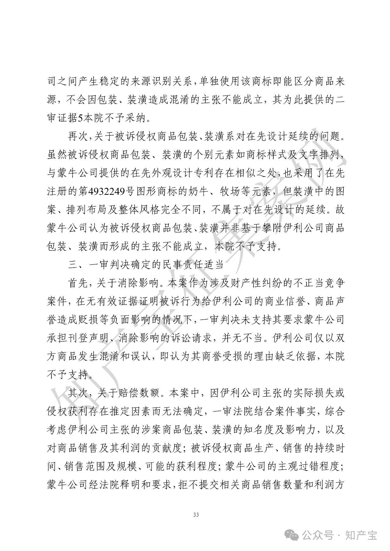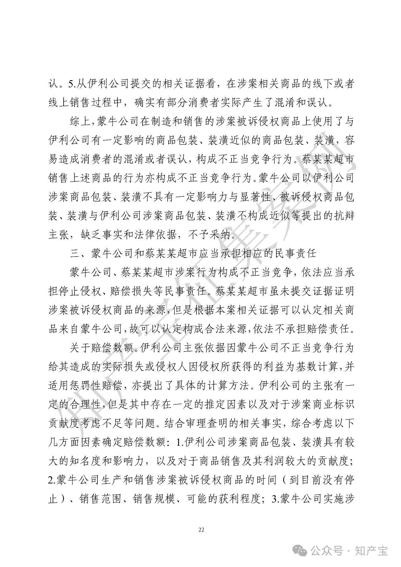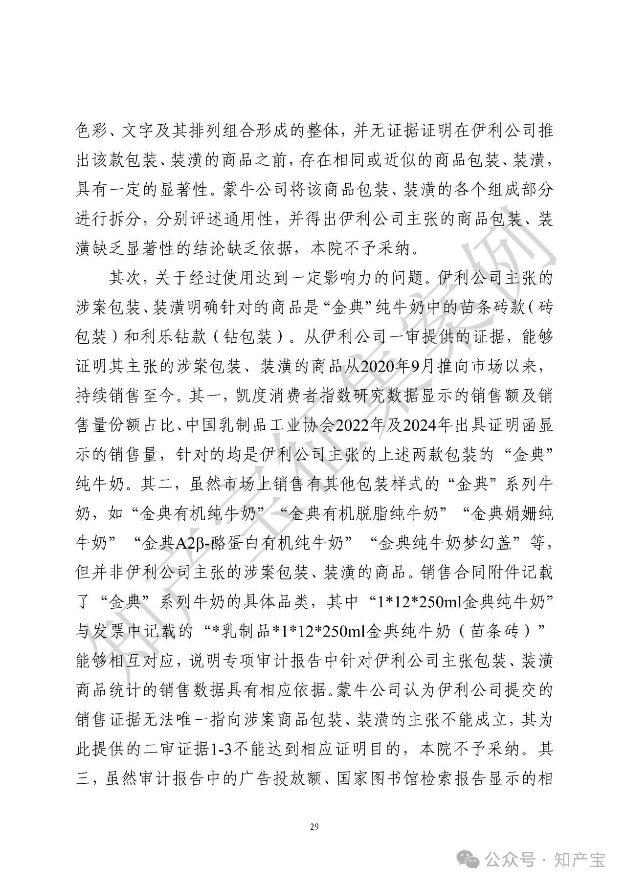 关于被诉行为是否构成擅自使用有一定影响商品包装、装潢的不正当竞争,法院认为:其一,包装、装潢近似比对应聚焦于发挥识别作用的主要部分及整体视觉效果,而非立体包装各面逐一比对。被诉包装与涉案包装在色彩、文字字体/位置、插图元素(奶牛、牧场、植物等)的艺术加工及整体风格上高度接近,局部差异(如插图未形成四分之三弧形花环)不足以区分整体视觉效果,构成近似。其二,结合涉案包装的高知名度、被诉包装的高度近似性、商品销售场景易混淆性及平台用户实际混淆评论等证据,足以认定易导致相关公众混淆。伊利公司“金典”商标的识别作用不排除包装、装潢的独立识别功能;蒙牛公司未在涉案商品上突出使用自有“蒙牛”商标,“精选牧场”子品牌因显著性弱、依赖“蒙牛”商标知名度,无法单独区分来源,故包装、装潢近似足以导致混淆。其三,被诉包装虽使用部分在先元素(如商标、奶牛图案),但其图案排列、整体风格与在先设计差异显著,不构成对在先设计的延续,攀附伊利公司包装、装潢的故意成立。