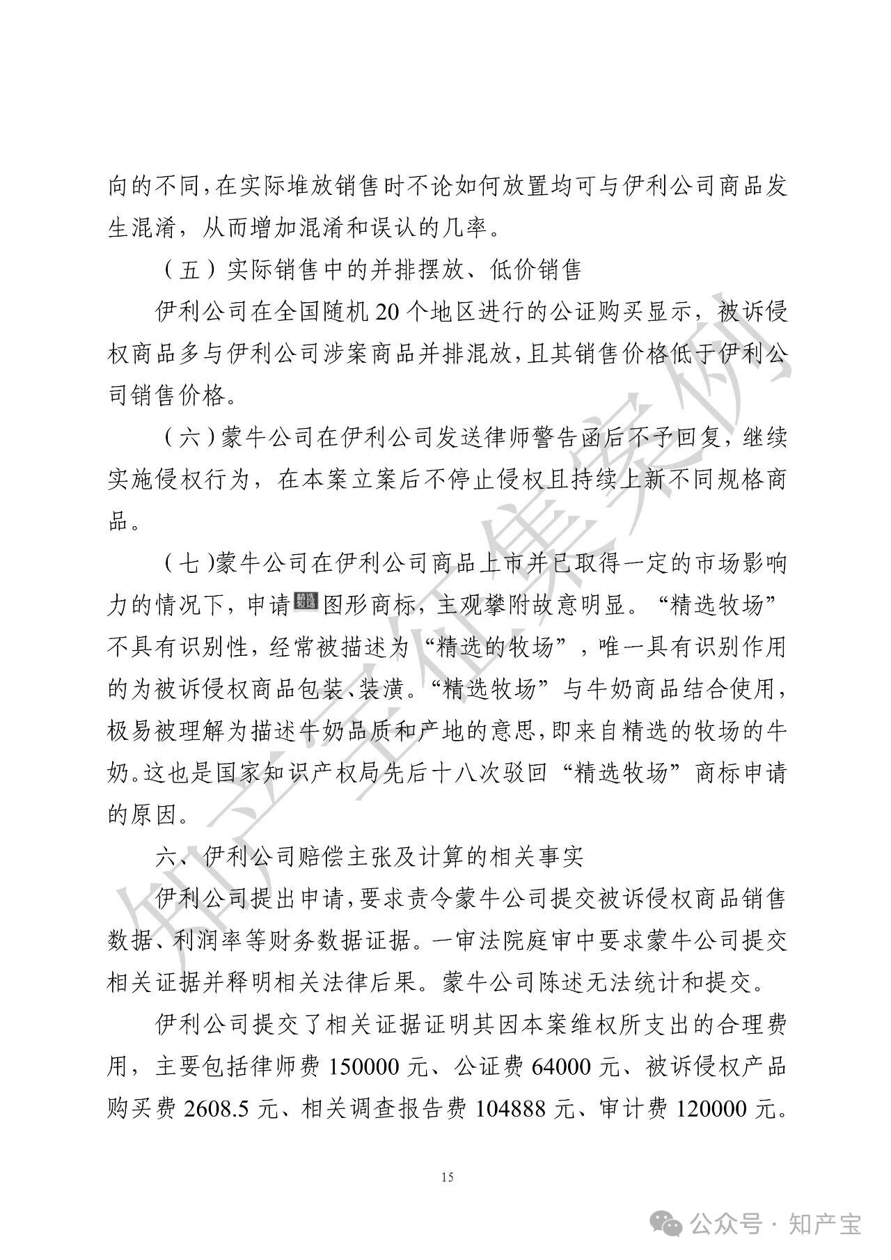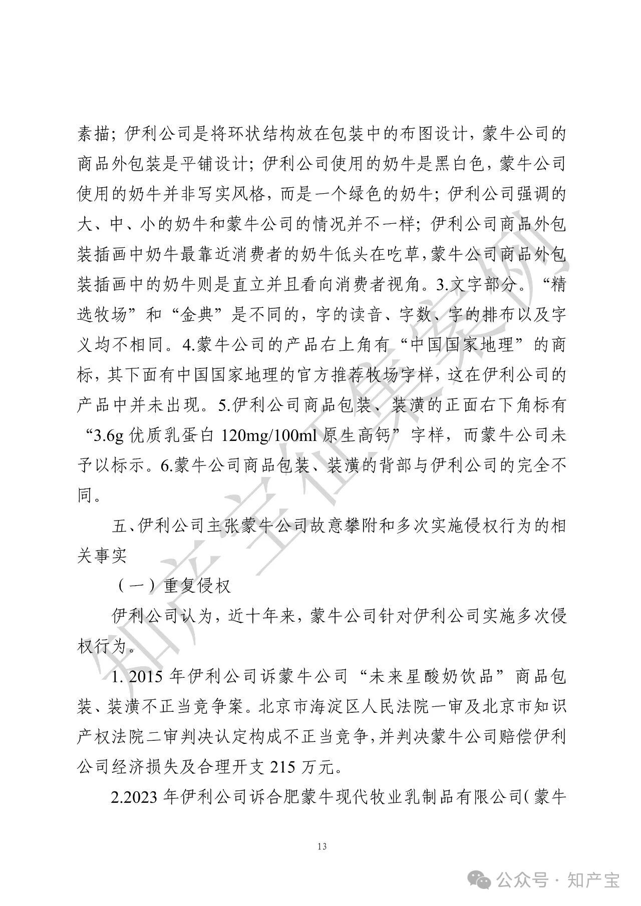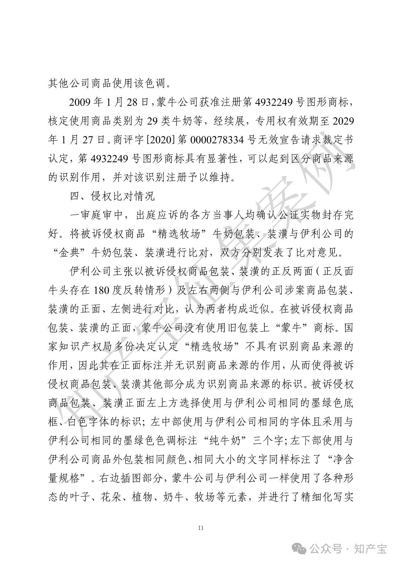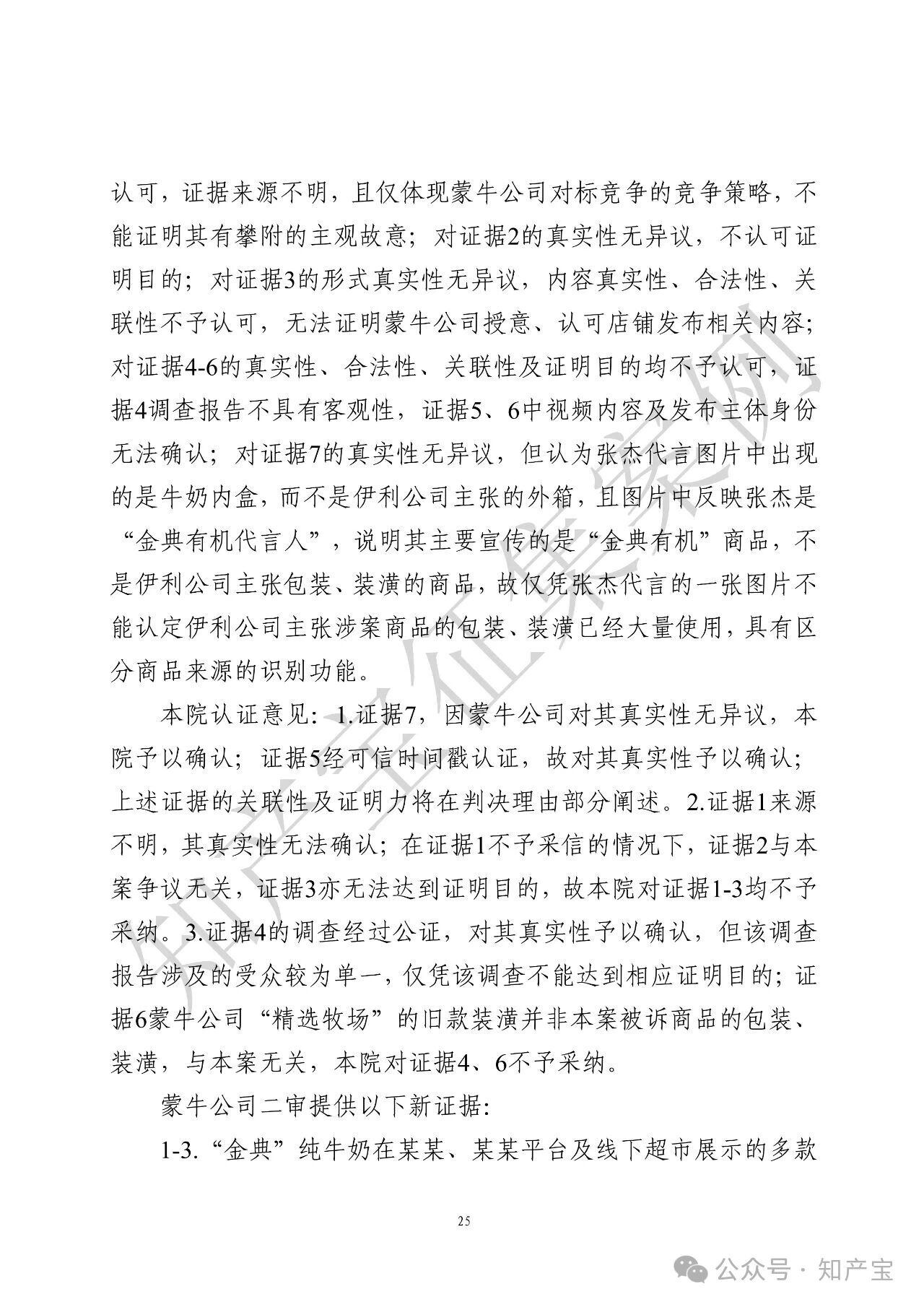 关于被诉行为是否构成擅自使用有一定影响商品包装、装潢的不正当竞争,法院认为:其一,包装、装潢近似比对应聚焦于发挥识别作用的主要部分及整体视觉效果,而非立体包装各面逐一比对。被诉包装与涉案包装在色彩、文字字体/位置、插图元素(奶牛、牧场、植物等)的艺术加工及整体风格上高度接近,局部差异(如插图未形成四分之三弧形花环)不足以区分整体视觉效果,构成近似。其二,结合涉案包装的高知名度、被诉包装的高度近似性、商品销售场景易混淆性及平台用户实际混淆评论等证据,足以认定易导致相关公众混淆。伊利公司“金典”商标的识别作用不排除包装、装潢的独立识别功能;蒙牛公司未在涉案商品上突出使用自有“蒙牛”商标,“精选牧场”子品牌因显著性弱、依赖“蒙牛”商标知名度,无法单独区分来源,故包装、装潢近似足以导致混淆。其三,被诉包装虽使用部分在先元素(如商标、奶牛图案),但其图案排列、整体风格与在先设计差异显著,不构成对在先设计的延续,攀附伊利公司包装、装潢的故意成立。