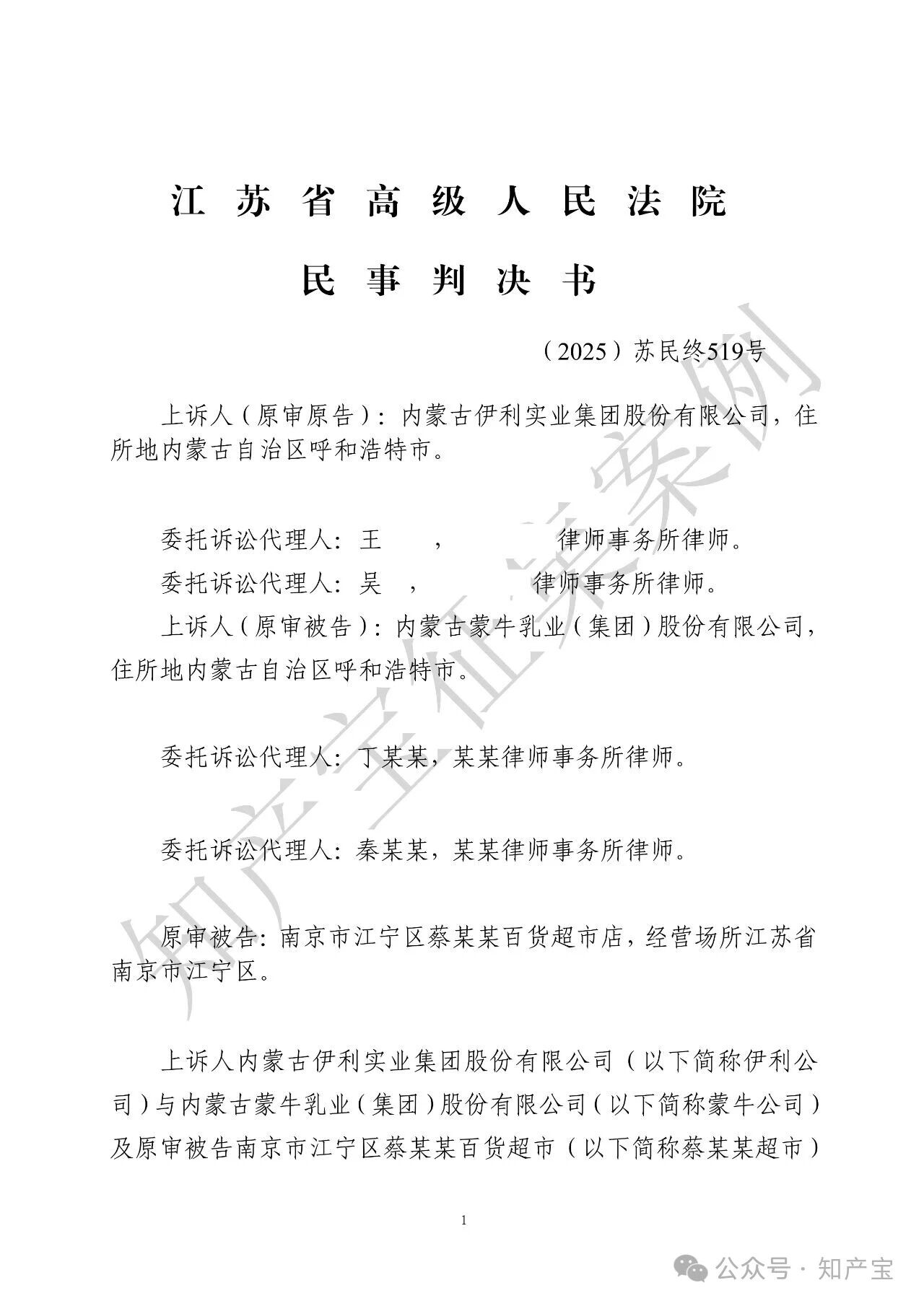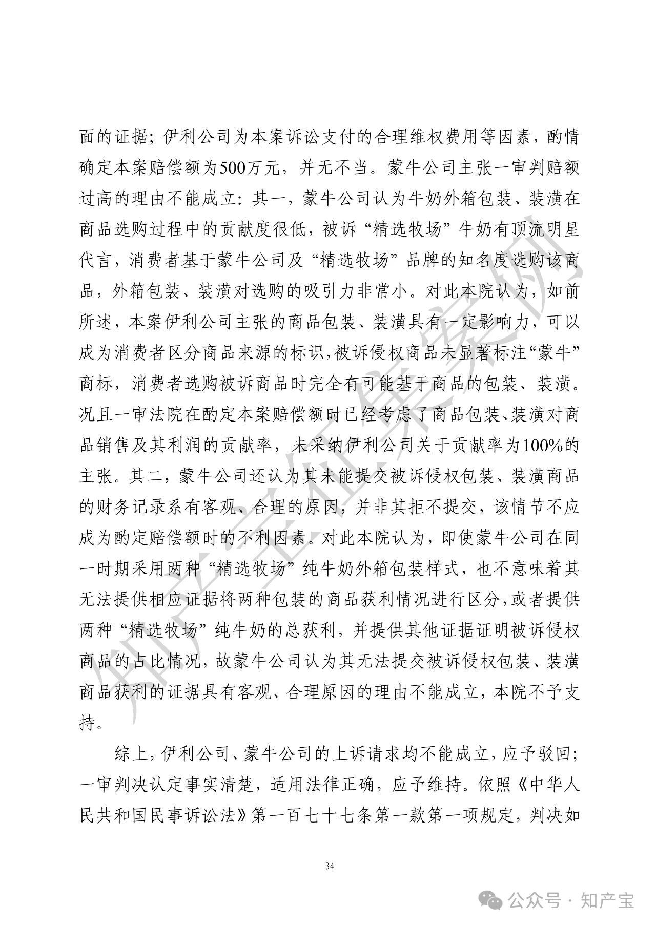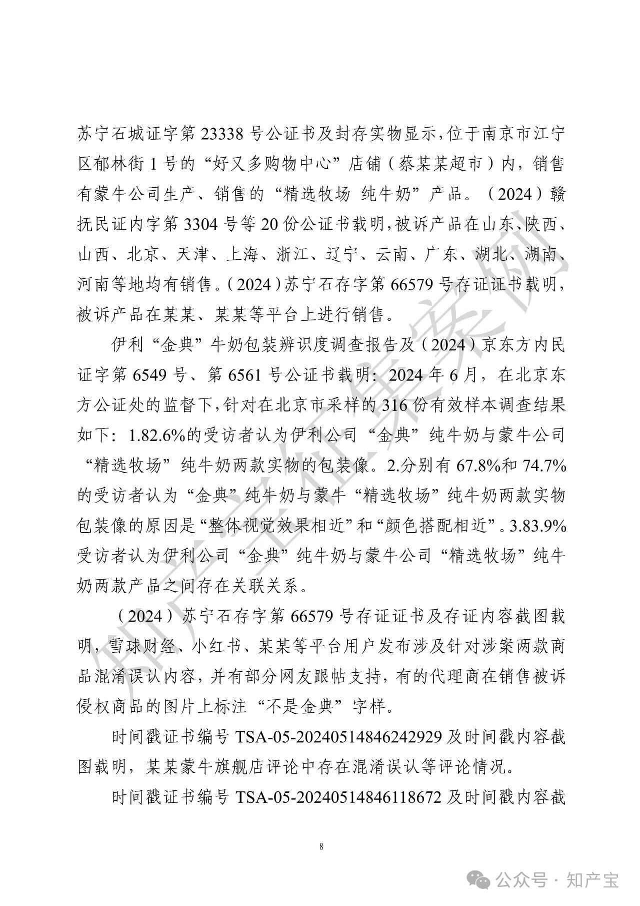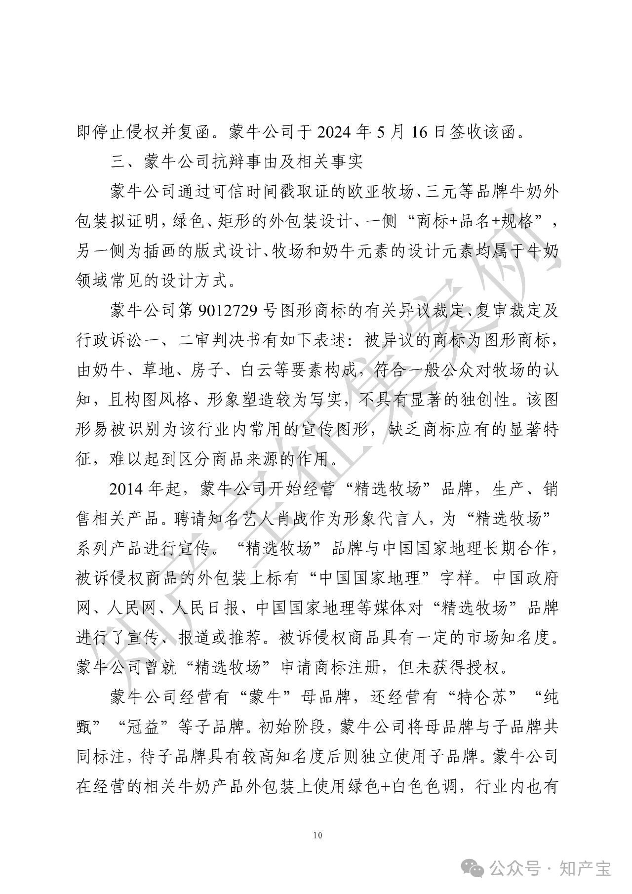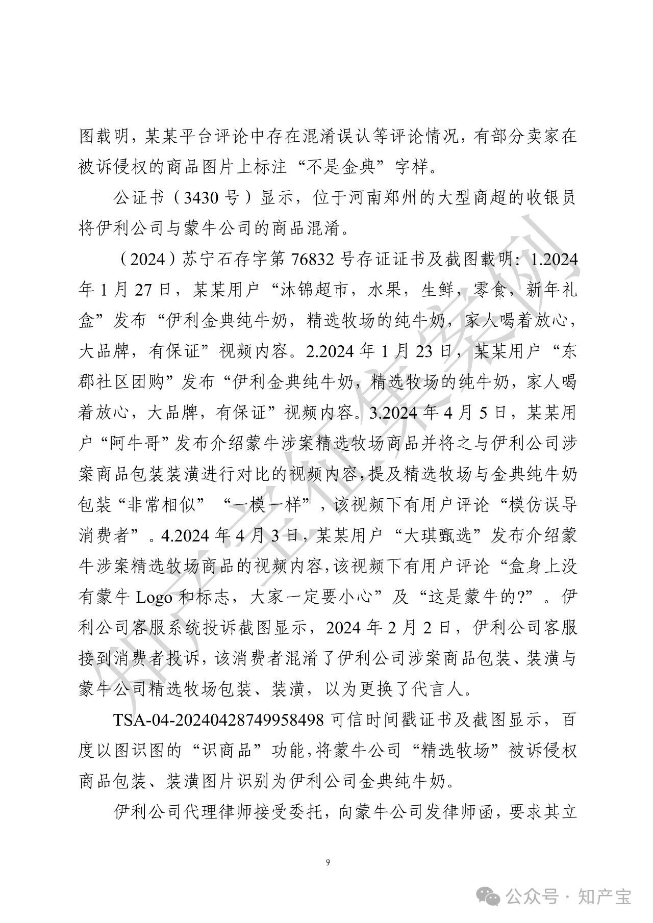 关于被诉行为是否构成擅自使用有一定影响商品包装、装潢的不正当竞争,法院认为:其一,包装、装潢近似比对应聚焦于发挥识别作用的主要部分及整体视觉效果,而非立体包装各面逐一比对。被诉包装与涉案包装在色彩、文字字体/位置、插图元素(奶牛、牧场、植物等)的艺术加工及整体风格上高度接近,局部差异(如插图未形成四分之三弧形花环)不足以区分整体视觉效果,构成近似。其二,结合涉案包装的高知名度、被诉包装的高度近似性、商品销售场景易混淆性及平台用户实际混淆评论等证据,足以认定易导致相关公众混淆。伊利公司“金典”商标的识别作用不排除包装、装潢的独立识别功能;蒙牛公司未在涉案商品上突出使用自有“蒙牛”商标,“精选牧场”子品牌因显著性弱、依赖“蒙牛”商标知名度,无法单独区分来源,故包装、装潢近似足以导致混淆。其三,被诉包装虽使用部分在先元素(如商标、奶牛图案),但其图案排列、整体风格与在先设计差异显著,不构成对在先设计的延续,攀附伊利公司包装、装潢的故意成立。