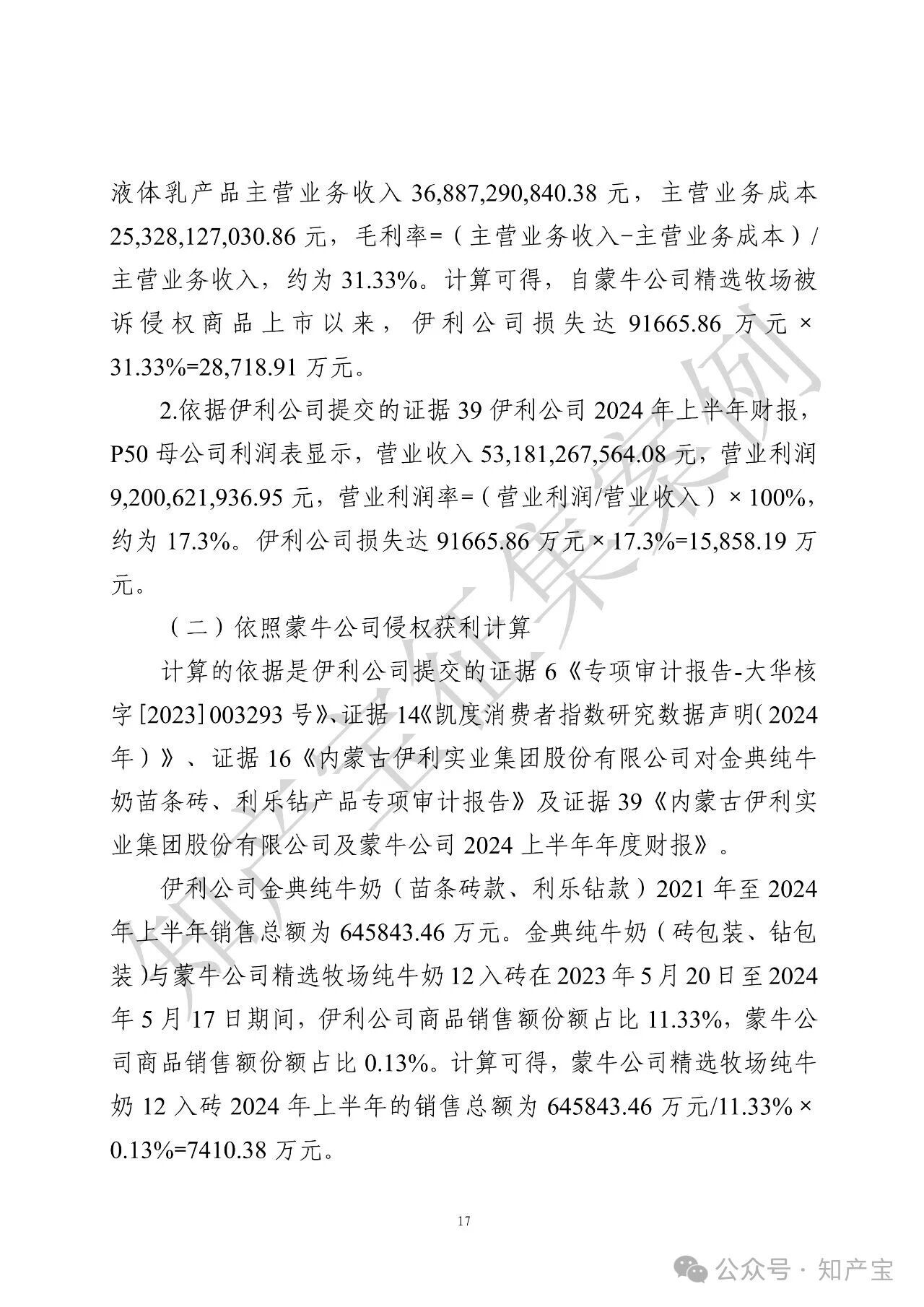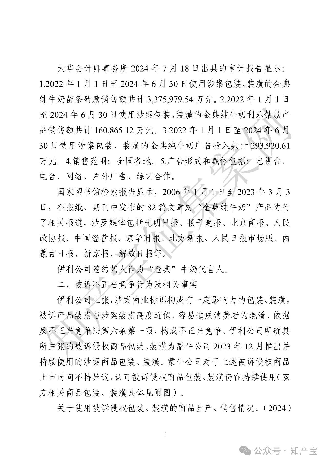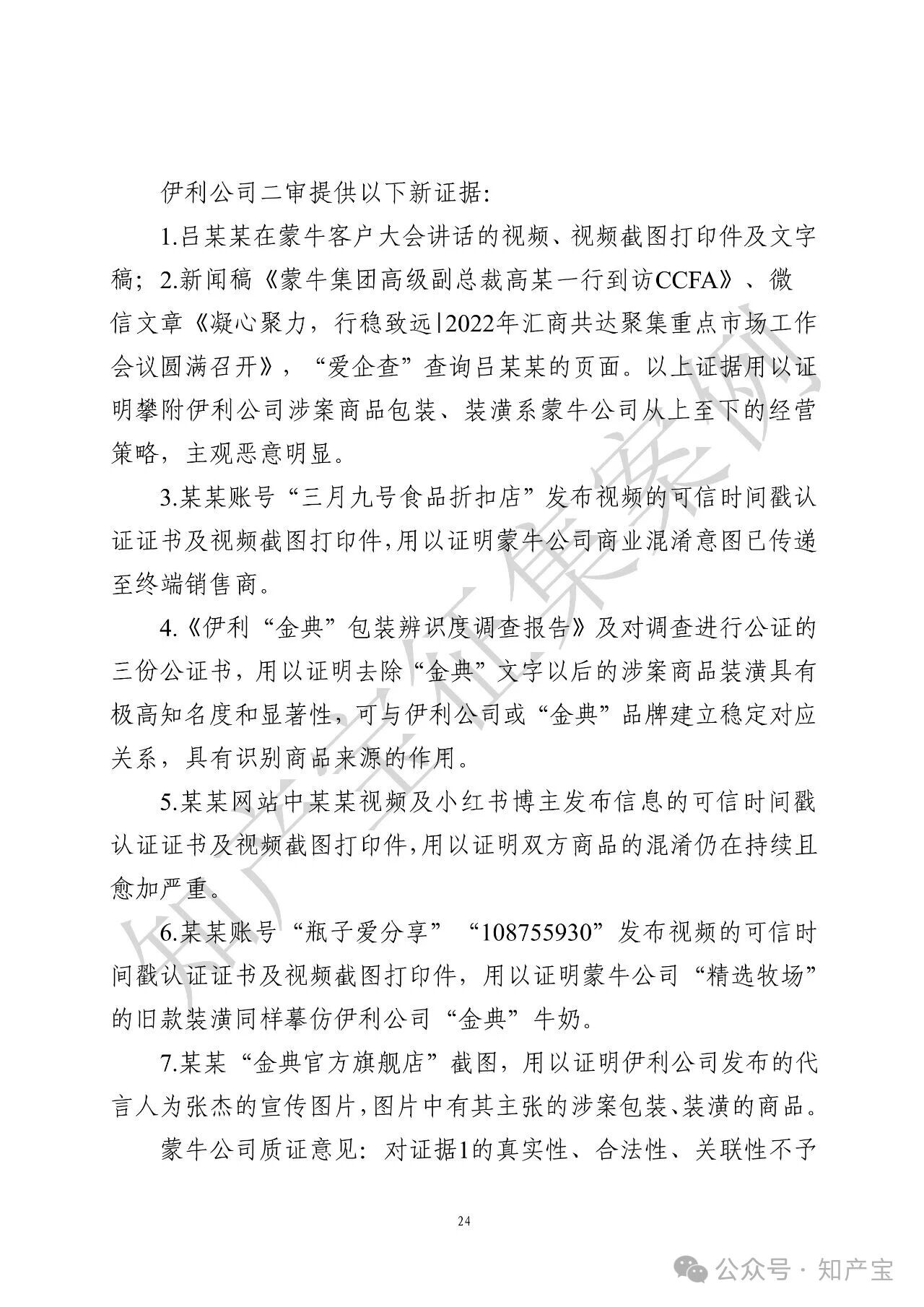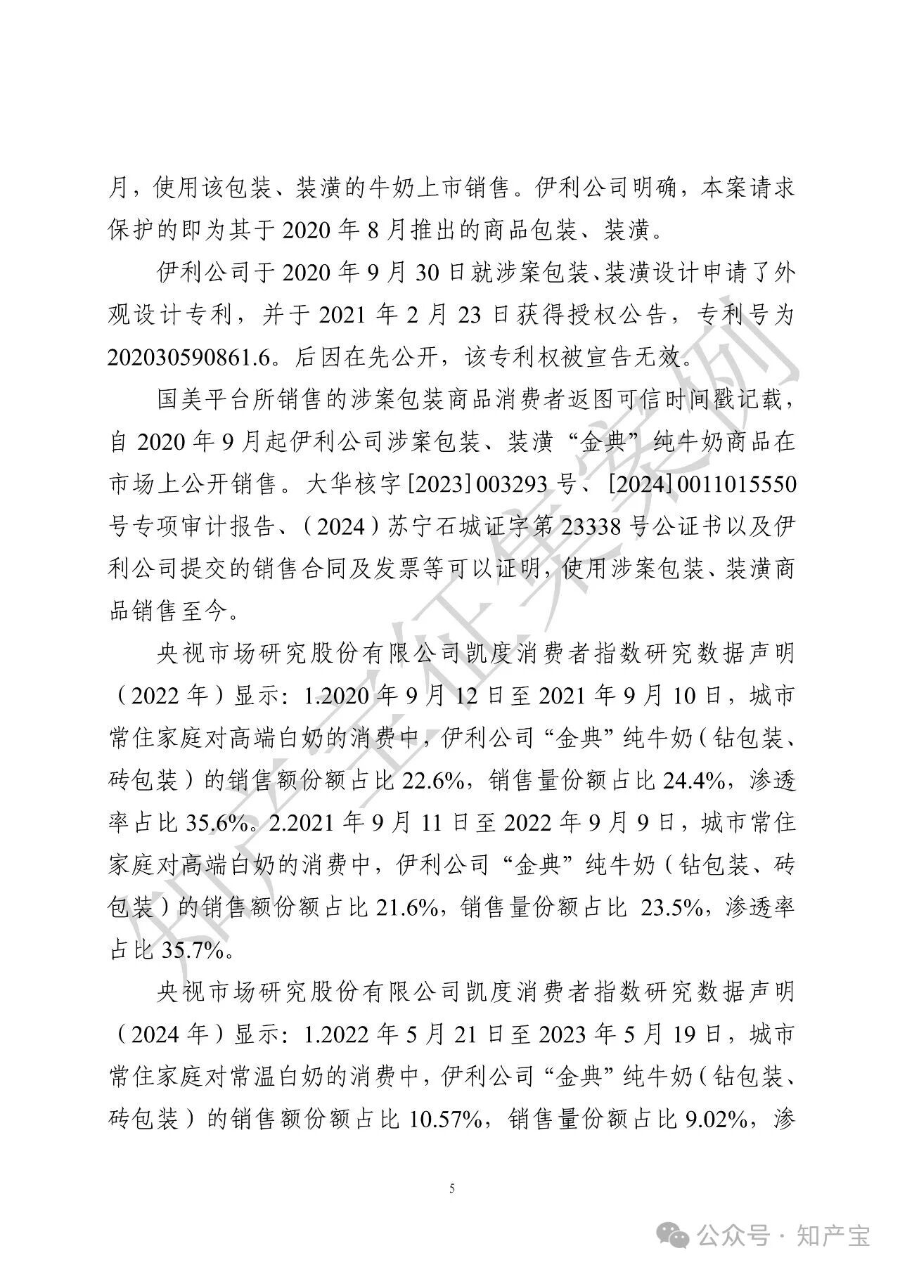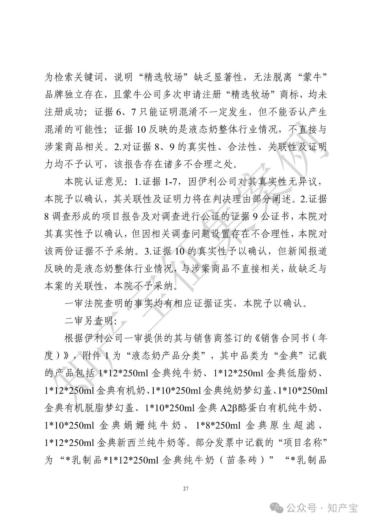 关于被诉行为是否构成擅自使用有一定影响商品包装、装潢的不正当竞争,法院认为:其一,包装、装潢近似比对应聚焦于发挥识别作用的主要部分及整体视觉效果,而非立体包装各面逐一比对。被诉包装与涉案包装在色彩、文字字体/位置、插图元素(奶牛、牧场、植物等)的艺术加工及整体风格上高度接近,局部差异(如插图未形成四分之三弧形花环)不足以区分整体视觉效果,构成近似。其二,结合涉案包装的高知名度、被诉包装的高度近似性、商品销售场景易混淆性及平台用户实际混淆评论等证据,足以认定易导致相关公众混淆。伊利公司“金典”商标的识别作用不排除包装、装潢的独立识别功能;蒙牛公司未在涉案商品上突出使用自有“蒙牛”商标,“精选牧场”子品牌因显著性弱、依赖“蒙牛”商标知名度,无法单独区分来源,故包装、装潢近似足以导致混淆。其三,被诉包装虽使用部分在先元素(如商标、奶牛图案),但其图案排列、整体风格与在先设计差异显著,不构成对在先设计的延续,攀附伊利公司包装、装潢的故意成立。