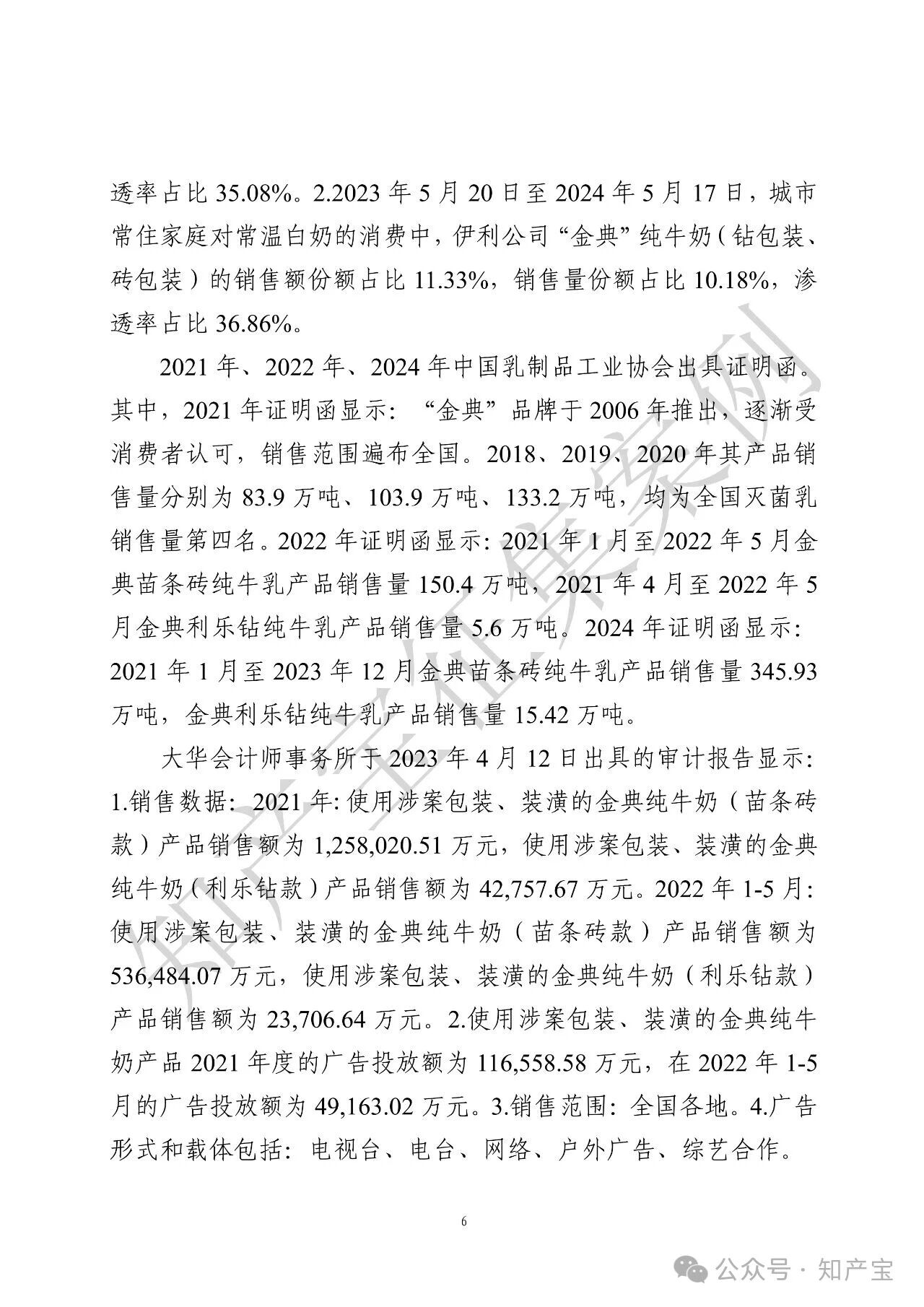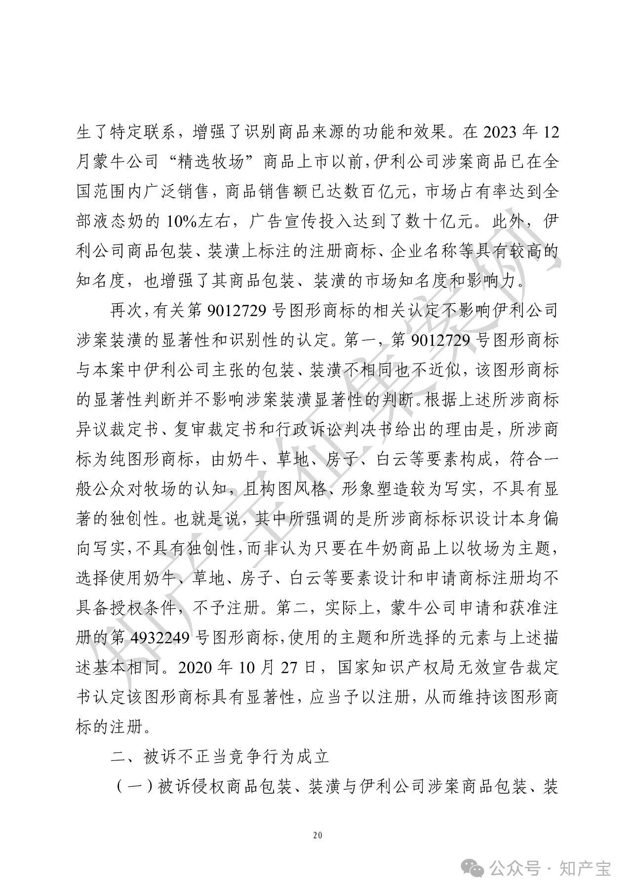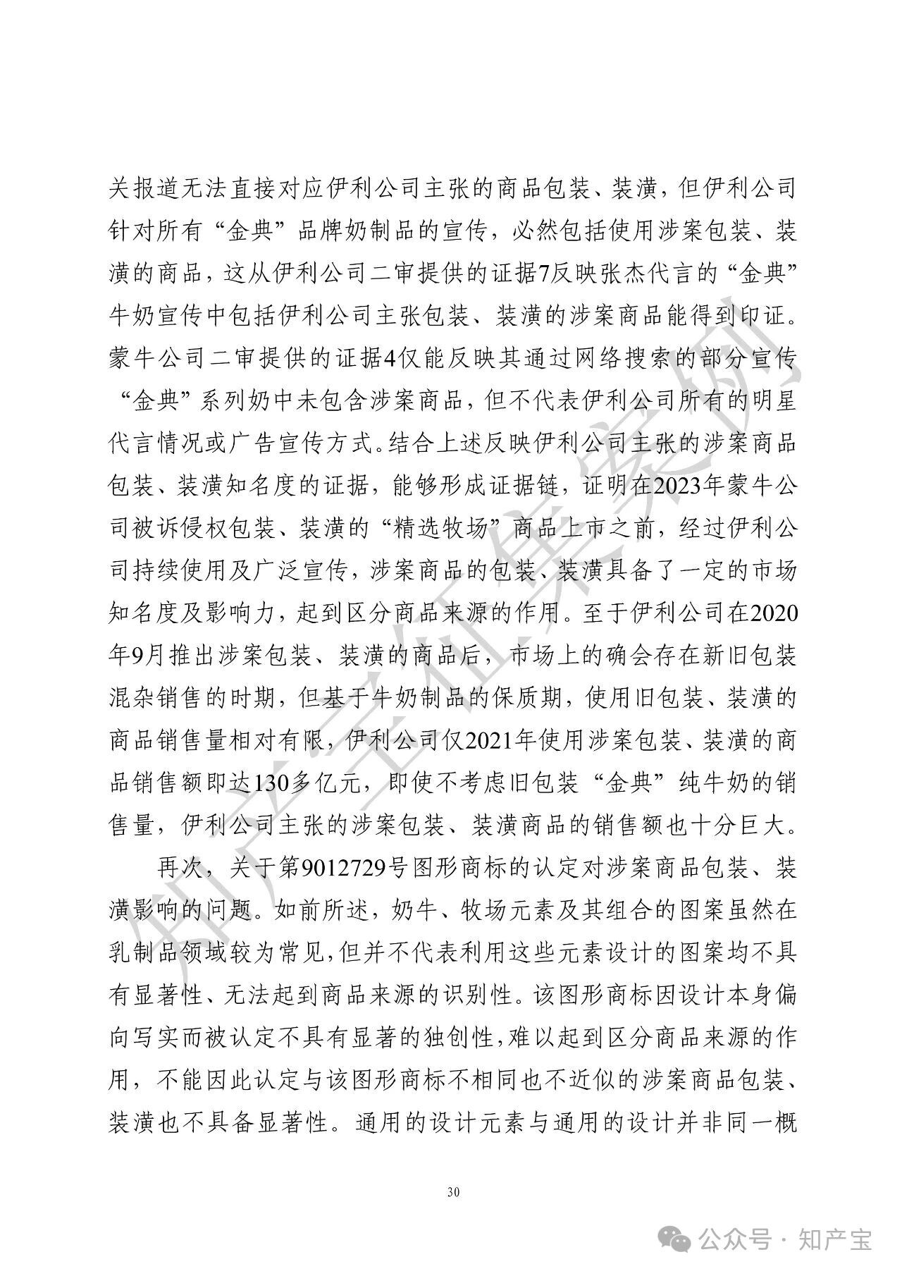 关于伊利公司主张的涉案商品包装、装潢是否构成“有一定影响的包装、装潢”,法院认为:其一,涉案包装、装潢虽采用乳制品领域常见的奶牛、牧场、绿色等设计元素,但其通过对元素的具体表达方式、组合排列、色彩搭配等进行个性化设计,形成了独特的整体风格,无证据证明此前存在相同或近似的商品包装、装潢,故具有显著性。蒙牛公司仅拆分元素评述通用性的抗辩缺乏依据,不予采纳。其二,涉案包装、装潢明确指向“金典”纯牛奶的苗条砖款和利乐钻款,伊利公司提交的凯度消费者指数、行业协会销售量证明、销售合同与发票对应数据等证据,充分证明该两款包装商品自2020年9月上市后持续销售,2021年涉案包装商品销售额即达130余亿元,市场知名度显著。尽管广告投放及媒体报道未直接对应涉案包装,但“金典”品牌整体宣传必然涵盖涉案包装商品(如张杰代言宣传中包含涉案商品),形成证据链证明其在蒙牛公司被诉侵权前已具备一定市场影响力,起到区分商品来源的作用。其三,第9012729号图形商标因写实风格被认定独创性不足,不代表基于同类元素设计的涉案包装、装潢必然缺乏显著性;通用设计元素与通用设计非同一概念,蒙牛公司主张“使用通用设计即违背公平竞争”无依据,不予支持。