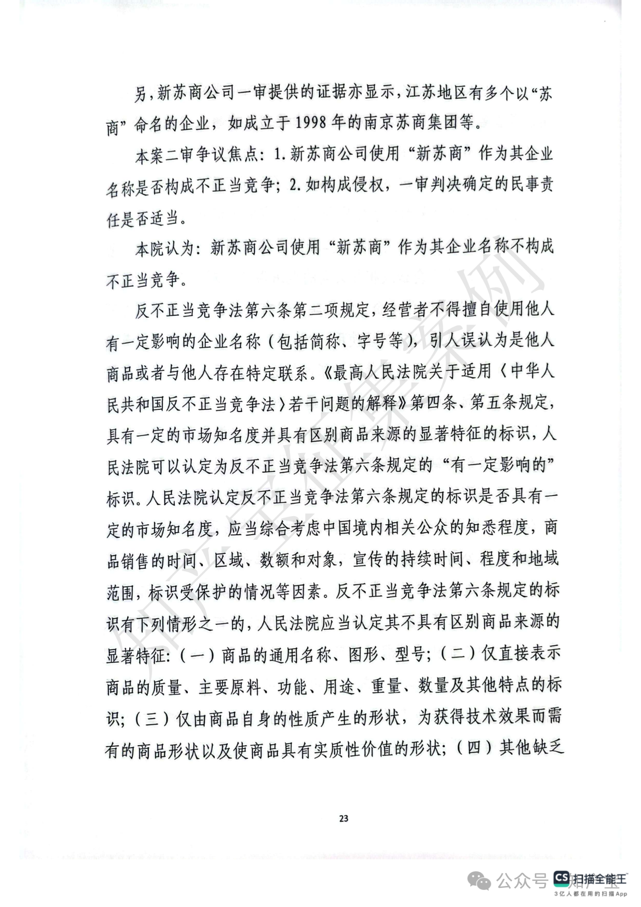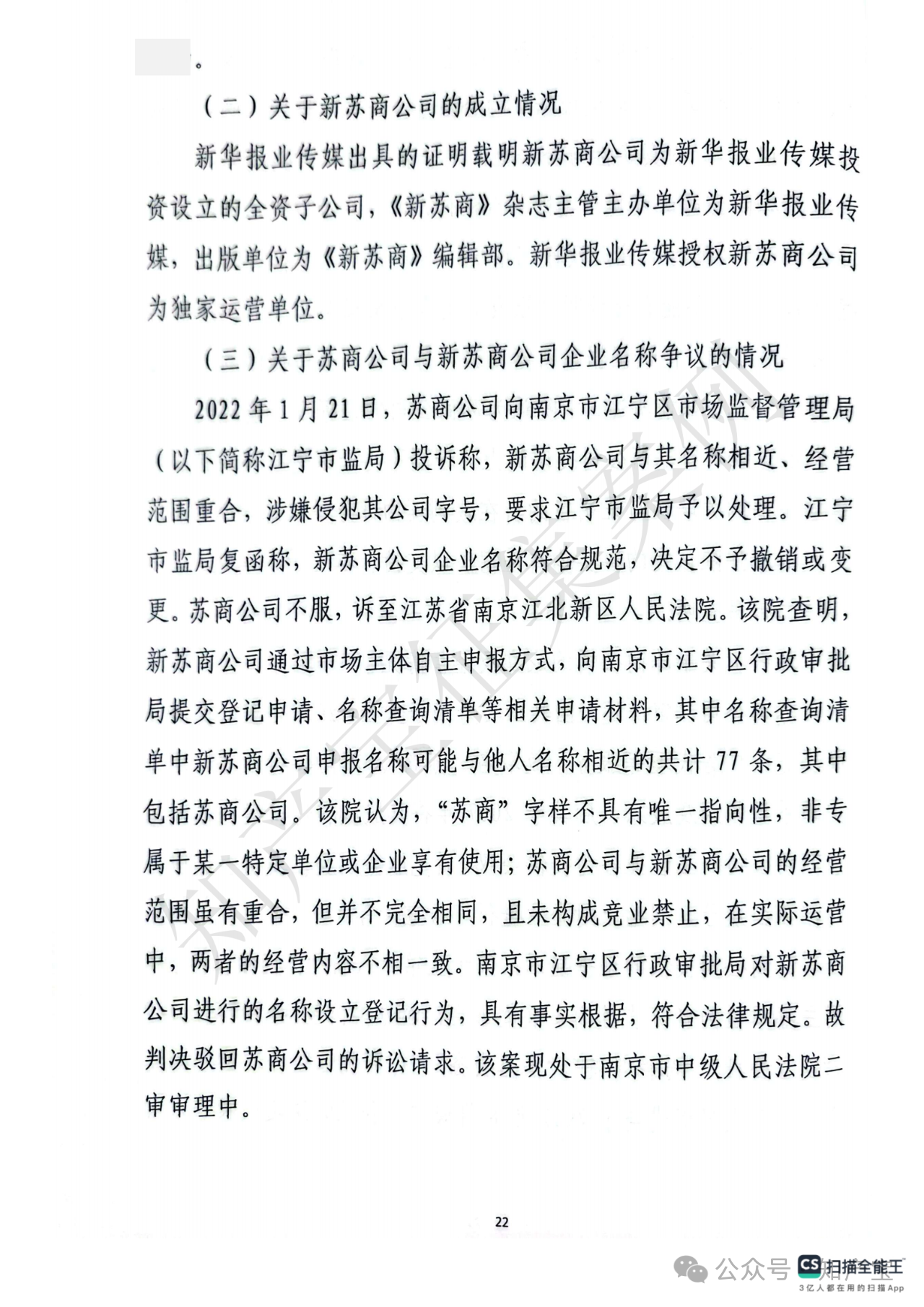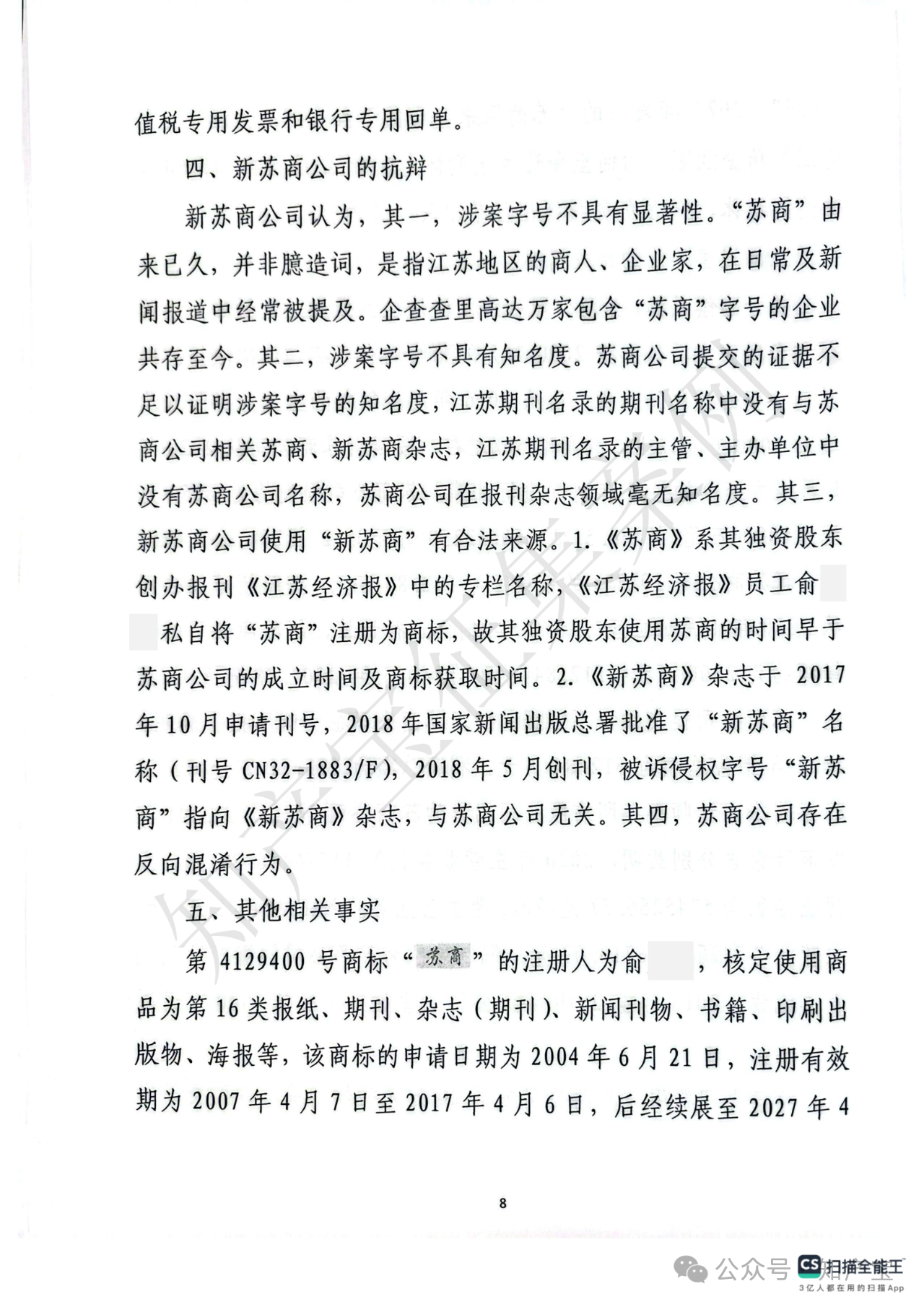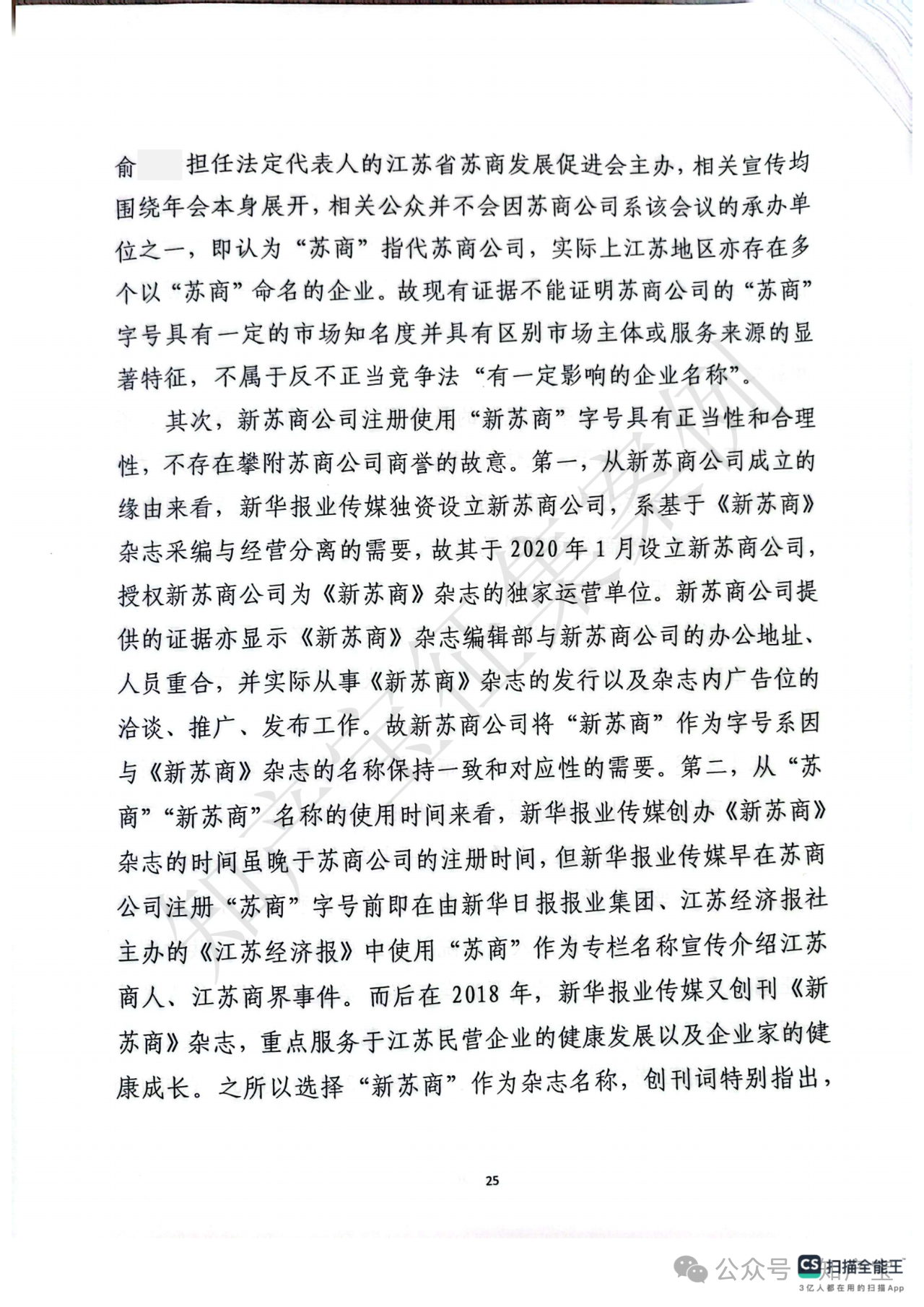 首先,关于江苏苏商传媒集团有限公司主张的“苏商”字号是否构成反不正当竞争法所?;さ摹坝幸欢ㄓ跋斓钠笠得啤?#xff0c;江苏省高院认定“苏商”二字缺乏固有显著性,现有证据不足以证明该字号经苏商公司持续使用后已具备指代或识别其市场主体或服务来源的显著特征。在日常使用及新闻报道中,“苏商”通常被作为指代江苏商人或江苏企业的通用词汇,故苏商公司的“苏商”字号不属于具有一定市场知名度且能区分商品或服务来源的企业名称。其次,关于江苏新苏商文化传媒有限公司注册使用“新苏商”字号的正当性,法院认为其行为不具有攀附苏商公司商誉的故意:其一,新苏商公司系新华报业传媒因《新苏商》杂志采编与经营分离需要而独资设立;其二,虽新华报业传媒注册新苏商公司的时间晚于苏商公司注册“苏商”字号的时间,但新华报业传媒早于苏商公司注册前已在《江苏经济报》中使用“苏商”作为专栏名称宣传江苏商人及商界事件,后于2018年创刊《新苏商》杂志时选择“新苏商”作为名称,创刊词明确“新江苏呼唤新苏商、新时代造就新苏商”,赋予“新苏商”特殊含义及明确指向,旨在服务江苏民营企业与企业家发展。综上,新苏商公司使用“新苏商”字号具有合理背景与正当意图,主观无攀附故意,不构成反不正当竞争法规定的“擅自使用”他人有一定影响企业名称的不正当竞争行为。