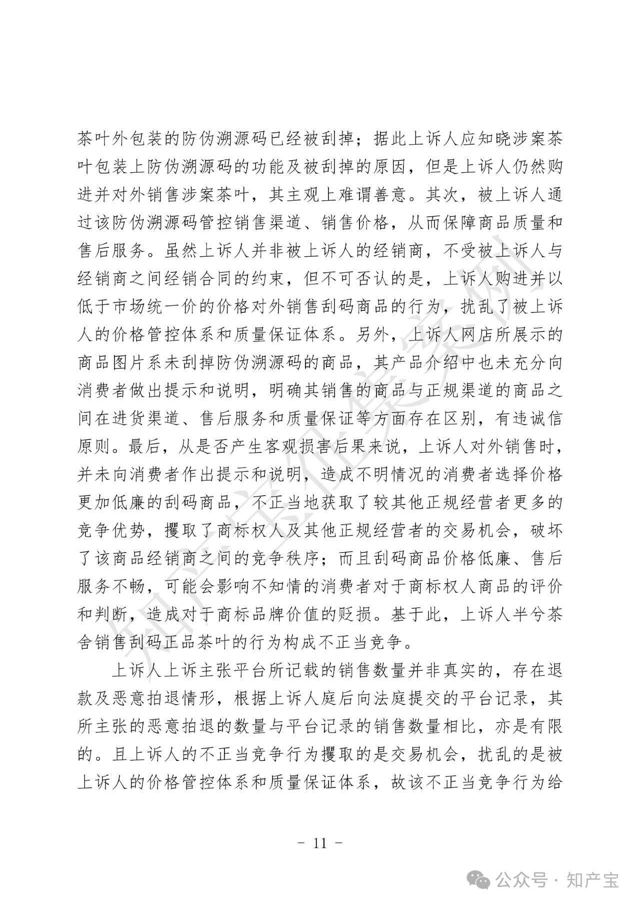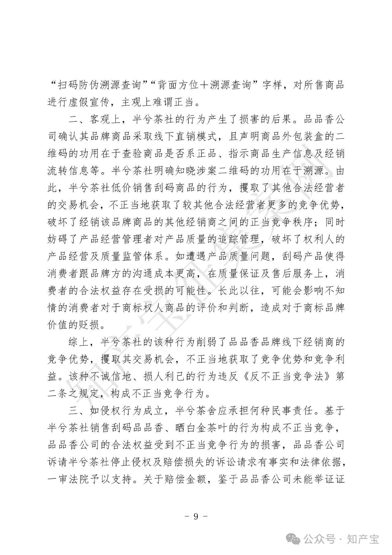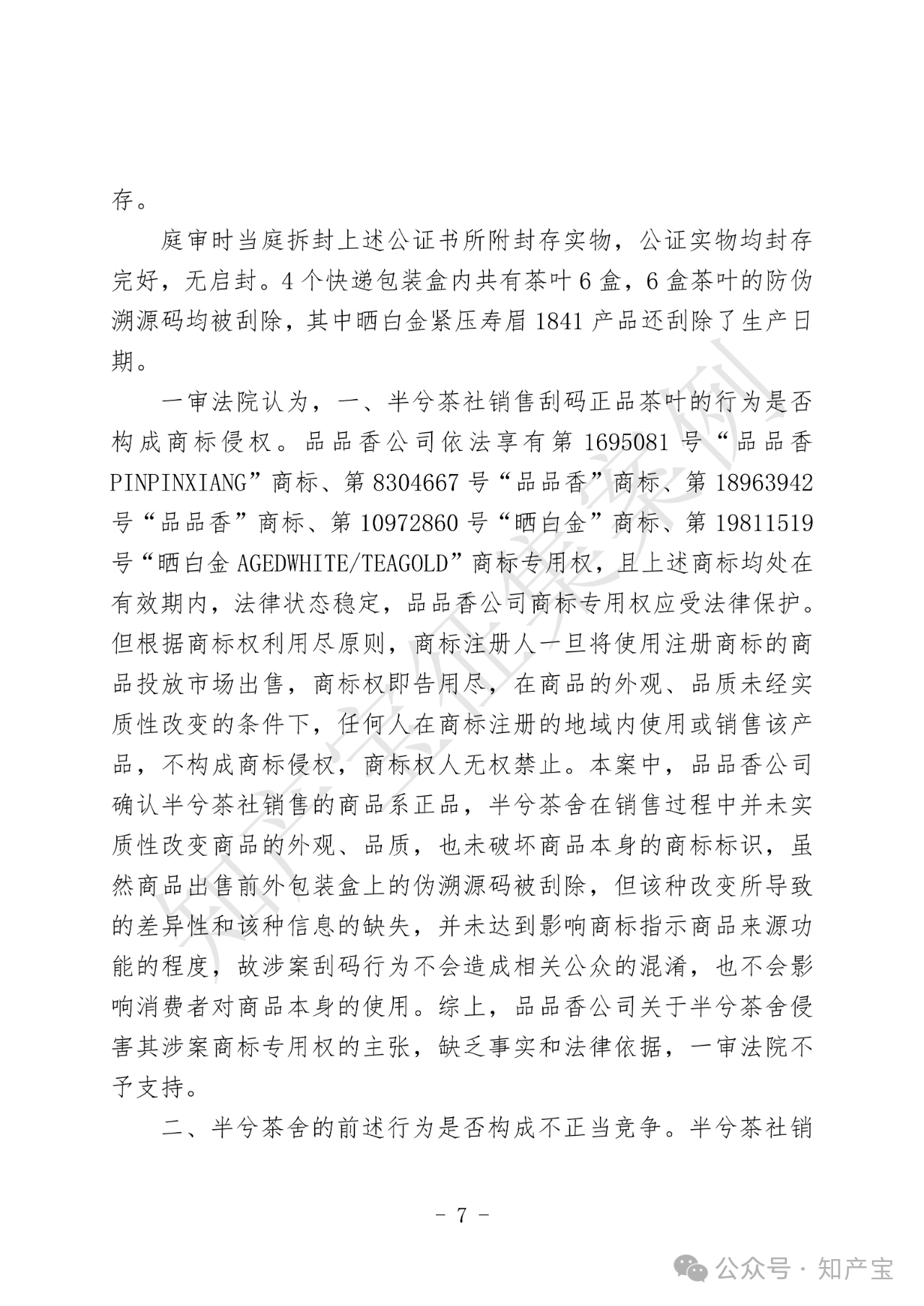 原告品品香品牌主营白茶产品,在2012年被相关机构认定为驰名商标。同时,品品香公司建立“一品一码”完善的产品质量安全可追溯管理制度,该制度是可追溯和防伪系统,能够为该公司和消费者提供识别、追溯商品来源以及辨别真伪的便利。被告半兮茶舍在网络运营店铺中销售刮掉溯源码、防伪码的品品香品牌白茶商品。品品香品牌茶叶公司主张被告刮码销售的行为构成商标权侵权及不正当竞争。