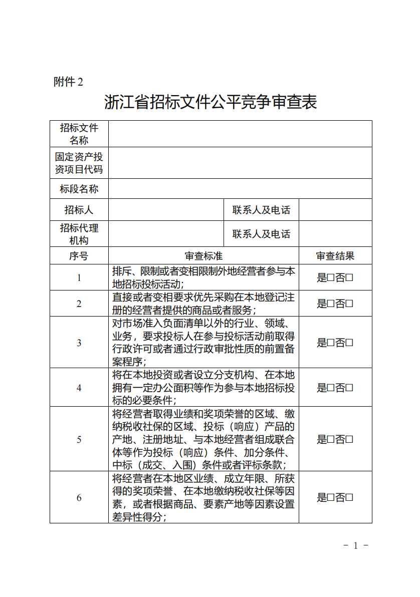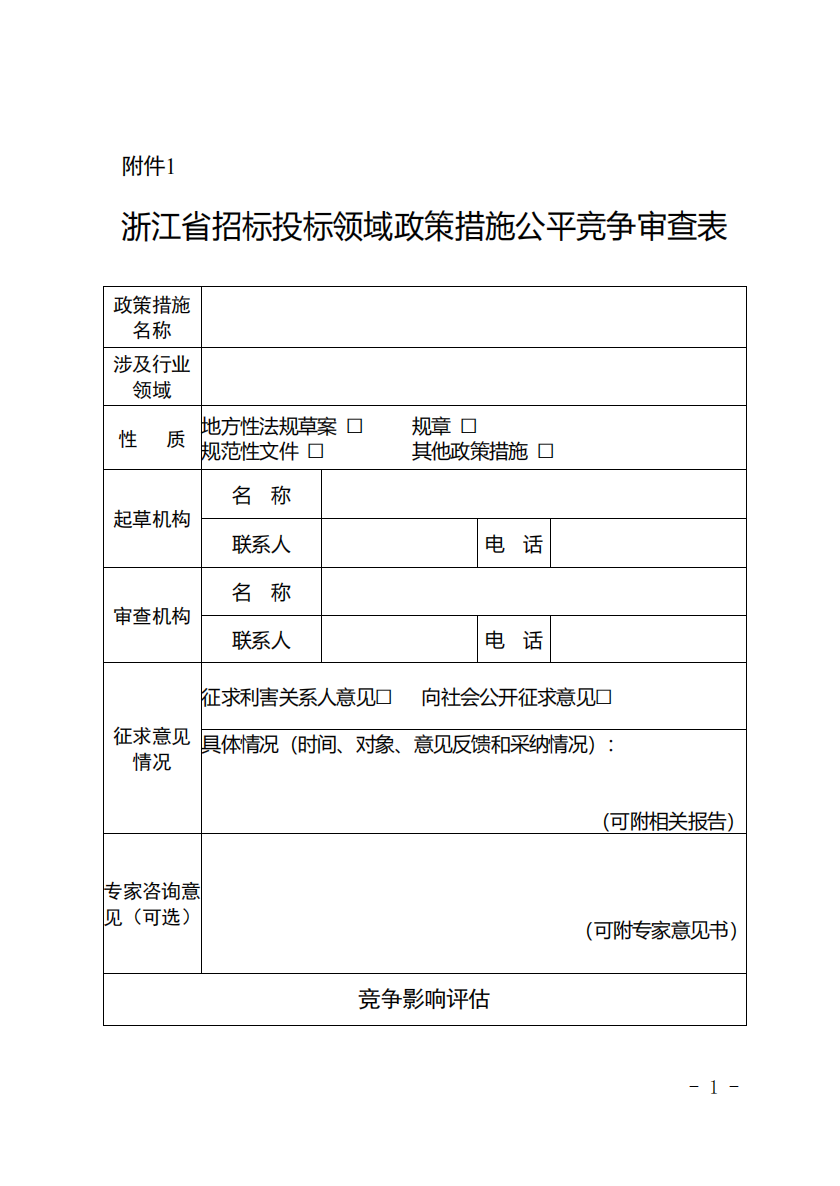 附件1. 浙江省招标投标领域政策措施公平竞争审查表