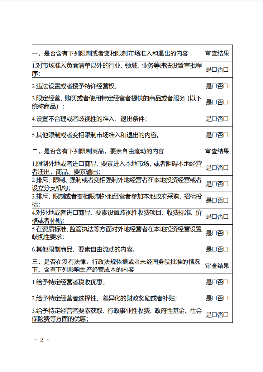 (一)政策措施的审查程序。起草单位应当在政策措施起草阶段开展公平竞争审查,并作出是否符合公平竞争审查标准的书面审查结论(可参考附件1)。拟由县级以上人民政府出台或者提请本级人民代表大会及其常务委员会审议的政策措施,起草单位应当开展初审,并将政策措施草案、初审意见等相关材料送市场监督管理部门审查;市场监督管理部门应当根据起草单位提供的材料对政策措施开展公平竞争审查,书面作出审查结论。