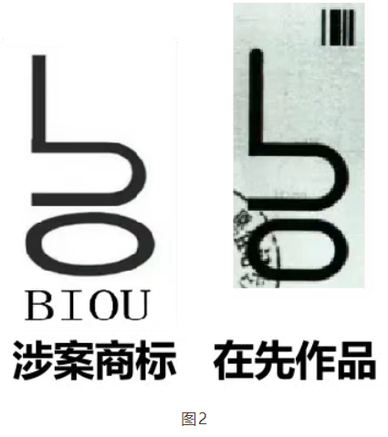 以(2017)粤73民终506号判决13为例(参见图2),二审法院认为,该图形系由英文字母“b”和“o”上下排列组合而成,虽然该字母经过变形处理,但这种变形处理尚未达到作为造型艺术作品的创造性高度,从图形的外在表现形式来看,亦无法体现出作者在美学领域的独特创造力和观念,缺乏美术作品所具有的审美意义。同时,由于作品是用于表达作者的思想情感或者传递一定的信息,故其表达必须有一定的长度,单纯的个别字词或字词的简单组合,往往难以完整表达作者的思想感情或者传递一定的信息。因此,最终没有认定该图形为作品。