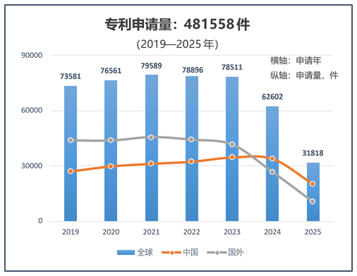 这一变化部分受国外申请量持续收缩影响,其从2019年的4.4万件降至2023年的4.2万件。与之相比,中国申请量保持韧性,于2023年达到峰值3.5万件,全球占比持续提升,已成为驱动全球专利布局的核心区域。