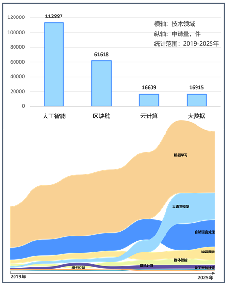 人工智能、区块链、云计算与大数据正以差异化节奏重塑金融科技。2019—2025年,全球人工智能专利申请量突破11万件,显著领先于其他技术,并维持着高基数的稳健增长,其中大语言模型(LLM)相关专利申请自2023年起进入爆发期。