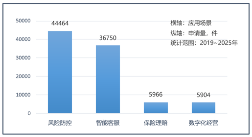 风险防控以最大专利申请量(全球超4.4万件)确立其基础设施地位,而数字化经营则以12.6%的年均增长率成为增长最快、格局最分散的新焦点,智能客服展现出更高的创新活跃度。核心技术应用呈现场景化特征,AI主导客服与理赔自动化,区块链则在风控与理赔中凸显可信价值。