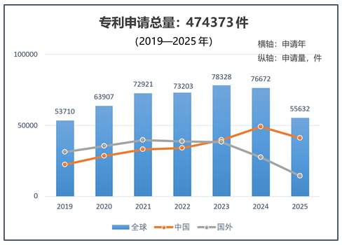2019—2025年(数据统计截至时间2025年11月30日),全球医疗健康行业累计专利申请量已突破47万件,其中2019—2023年呈现逐年稳健攀升的发展态势。