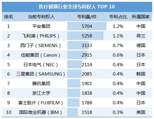 二、全球医疗健康行业专利竞争格局:TOP 10 专利权人聚焦亚欧美,平安、飞利浦领跑全球