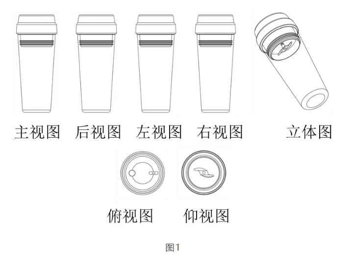 如图1所示,涉案专利为一件以绘制视图形式提交的外观设计专利,涉及一款便携榨汁杯[1],涉案专利视图包括六面正投影视图和立体图,从多个视角展示了这款榨汁杯。