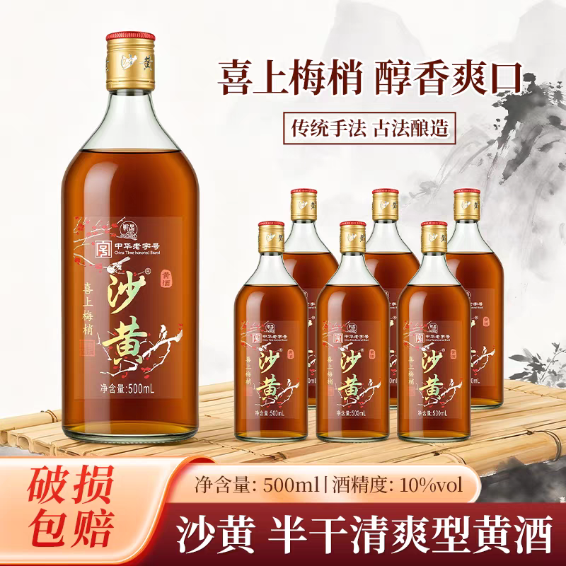 “沙洲优黄”品牌旗下有多款黄酒产品,其中“喜上梅梢”黄酒的包装装潢更是设计独特:整体红色基调,搭配金黄色文字与图案,瓶身有“沙洲优黄”字样、金色花枝、红色梅花和喜鹊,下方还有“喜上梅梢”字样。这套设计从2007年启用,经过长期销售推广,“喜上梅梢”黄酒光是2022-2023年销售额就超8400万元。