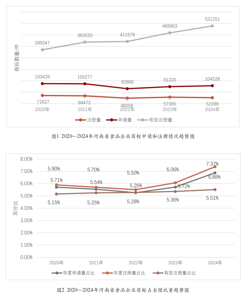 2020―2024年间,河南省食品企业商标有效注册量持续增加,年度申请量和注册量存在一定波动。2022年商标申请量下降至约8.3万件,2023―2024年逐步恢复,呈探底回升趋势(见图1),申请量基本恢复至2020年水平,但注册量未能同步恢复,且年度商标授权率由2020年的69.25% 大幅下滑至 2024年的50.02%。尽管如此,河南省食品企业在全国食品市场中的活跃度和竞争力正逐步提升。自2022年开始,年度申请量和注册量两个维度占全国的比重均呈现稳步增长趋势,年度注册量占全国比重已从2022年的5.5% 提升至2024年的7.37%(见图2),充分显示河南省食品企业品牌建设与?;ひ馐对诓欢显銮?。
