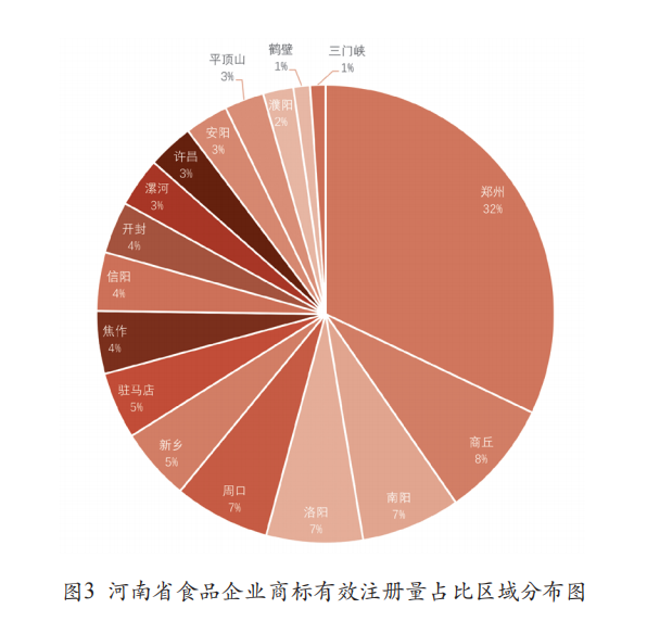 截至2024年底,郑州市食品业有效商标注册量占全省比例高达32%,前5名地级市占全省总量的61%,区域分布较为集中,存在一定的区域差异性。漯河、郑州等市的食品企业品牌意识较强,培育出了双汇、三全等全国知名品牌;但部分城市的食品企业品牌建设相对滞后,缺乏具有影响力的企业品牌或区域公用品牌,难以形成产业集群优势或区域品牌效应,影响了全省食品企业商标品牌的均衡发展和整体价值提升。