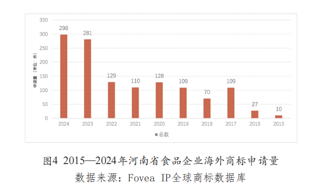 2015―2024年期间,河南省食品企业海外商标申请量呈快速增长趋势,从2015年的10件升至2024年的298件(见图4),年均增长率40.4%。这一增长趋势说明河南省食品企业品牌国际化?;ひ馐断灾銮?。