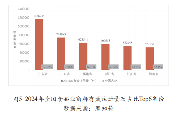 一是体现在商标注册总量不足。河南省食品企业虽有52万余件注册商标,但全国占比仅为5.51%(见图5),与经济大省、农业大省的地位不相匹配。二是自主品牌建设缺失。多数中小食品企业处于“有商标无品牌”或“贴牌代工”的状态,许多企业注册商标仅为满足经营需求。除去少数知名龙头食品企业品牌,多数品牌在全国市场的知名度和占有率均较低,导致大量优质食品因缺乏自主品牌支撑而限于本地销售,难以形成全国性竞争力。
