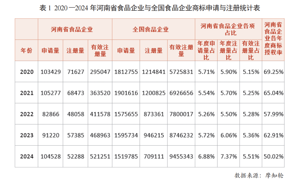 摘 要:河南省作为我国农业大省和食品工业强省,食品产业是其重要经济支柱。本文通过梳理河南省食品企业近五年国内商标申请量、近十年国际商标申请量、地理标志商标注册量等相关数据,系统分析河南省食品企业国内、国际商标申请注册趋势及地理标志发展现状,剖析存在的政策落地效能不足、商标品牌建设保护意识薄弱、地理标志商标数量偏少、区域品牌产业协同效应不足、国际竞争力不强等问题,并提出相应对策建议,为推动河南省从“食品加工大省”向“食品品牌强省”转型 , 加强商标品牌建设,提高市场竞争力提供参考。?