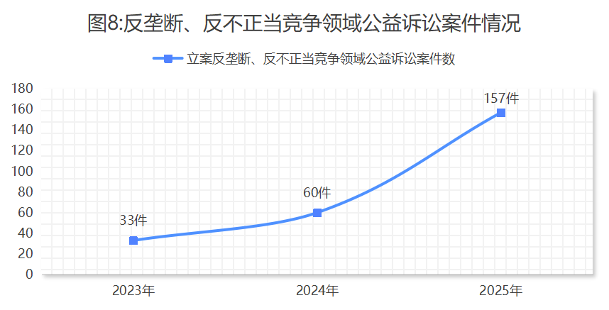 3.强化反垄断和反不正当竞争监督。立案反垄断、反不正当竞争领域公益诉讼案件157件,同比上升1.6倍,其中反垄断领域31件,反不正当竞争领域126件。?